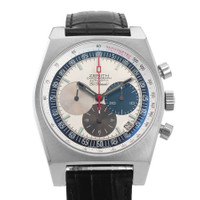 Silver-tone stainless steel case with a black leather strap. Fixed silver-tone stainless steel bezel. White dial with black hands and index hour markers. Minute markers around the outer rim. Dial Type: Analog. Luminescent hands and markers. Date display between 4 and 5 o'clock position. Chronograph - three sub-dials displaying: 60 second, 30 minute and 12 hour. Automatic movement. Scratch resistant sapphire crystal. Screw down crown. Round case shape, case size: 40 mm. Buckle clasp. Functions: chronograph, date, hour, minute, second. El Primero Vintage 1969 Series. Luxury watch style. Watch label: Swiss Made. Pre-owned Zenith El Primero Vintage 1969 Chronograph Automatic White Dial Men's Watch 03.1969.469. GENERAL Collection Name: El Primero Vintage 1969 INFORMATION Brand: Zenith Series: El Primero Vintage 1969 Model: 03.1969.469 Gender: Mens Watch Label: Swiss Made Movement: Automatic CONDITION INFORMATION Box: Yes Preowned Item Condition: Very Good Papers: No Year: Circa 2013 Comments: This Zenith El Primero Vintage 1969, reference number 03.1969.469, has a manufacturer year of Circa 2013. Box Included, Papers not included It is on an Aftermarket Black leather strap but does come with a Zenith signed leather strap in Green. . This watch has a 40mm Steel Case with Steel bezel, White No numerals dial and Leather bracelet with Buckle. The Automatic movement has Chronograph function. The wrist measures 7.5 inches or 19.05 centimeters. The condition is Very Good The watch listed i CASE Case Size: 40 Case Material: Stainless Steel Case Shape: Round DIAL Type: Analog Dial Color: White Crystal: Scratch Resistant Sapphire Hands: Black Second Markers: Minute Markers around the outer rim Dial Markers: Index Sub Dials: Three - 60 Second, 30 Minute and 12 Hour Luminiscence: Hands and Markers Bezel: Fixed Bezel Color: Silver-tone Bezel Material: Stainless Steel Crown: Screw Down BAND Band Type: Strap Band Material: Leather Band Color: Black Clasp: Buckle FEATURES Calendar: Date display between 4 and 5 o'clock position Functions: Chronograph, Date, Hour, Minute, Second Watch Features: Analog, Leather, Stainless Steel, Chronograph ADDITIONAL INFO Watch Style: Luxury Warranty: 1 Year Jomashop Warranty Jomashop Sku: PRE-P-ZE88611 Department: Watches