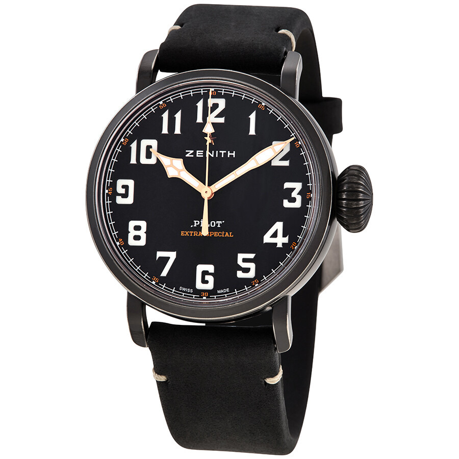 Black (aged) stainless steel case with a black (oily nubuck) leather (rubber lined) strap. Fixed black (aged) stainless steel bezel. Matte black dial with luminous rose gold-tone cathedral-style hands and Arabic numeral hour markers. Minute markers around the outer rim. Dial Type: Analog. Luminescent hands. Zenith calibre Elite 679 automatic movement, based upon Zenith Elite 680, containing 27 Jewels, composed of 126 parts, bitting at 28800 vph, and has a power reserve of approximately 50 hours. Scratch resistant sapphire crystal. Solid case back. Round case shape. Case size: 45 mm. Case thickness: 14.25 mm. Band width: 22 mm. Tang clasp. Water resistant at 100 meters / 330 feet. Functions: hour, minute, second. Pilot watch style. Watch label: Swiss Made. Zenith PILOT Type 20 Automatic Men's Watch 11.2432.679/21.C900. GENERAL Comments: Includes manual Preowned Item Condition: Very Good CASE Case Thickness: 14.25 mm Case Material: (Aged) Stainless Steel Case Shape: Round Case Back: Solid BAND Band Material: (Oily Nubuck) Leather (Rubber Lined) Band Type: Strap Band Color: Black Band Width: 22 mm Clasp: Tang DIAL Dial Color: Matte Black Type: Analog Crystal: Scratch Resistant Sapphire Hands: Luminous Rose Gold-tone Cathedral-style Dial Markers: Arabic Numeral Second Markers: Minute Markers around the outer rim Luminiscence: Hands Bezel: Fixed Bezel Color: Black Bezel Material: (Aged) Stainless Steel INFORMATION Brand: Zenith Series: Pilot Type 20 Collection Name: PILOT Type 20 Gender: Mens Model: 11.2432.679/21.C900 Watch Label: Swiss Made Movement: Automatic Engine: Zenith Calibre Elite 679 Power Reserve: 50 hours FEATURES Water Resistance: 100 meters / 330 feet Functions: Hour, Minute, Second Watch Features: Analog, Gold, Leather, Rubber, Stainless Steel, Titanium ADDITIONAL INFO Watch Style: Pilot Warranty: 1 Year Jomashop Warranty Jomashop Sku: PRE-ZE11243267921C90 Department: Watches Category: Watches