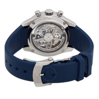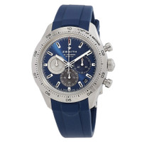 Silver-tone stainless steel case with a blue rubber strap. Fixed silver-tone stainless steel bezel. Blue dial with silver-tone hands and index hour markers. Minute markers around the outer rim. Dial Type: Analog. Luminescent hands and markers. Date display between 4 and 5 o'clock position. Chronograph - three sub-dials displaying: 60 second, 60 minute and 1/10th of a second. Zenith Calibre El Primero 3600 Automatic movement, containing 35 Jewels, composed of 311 parts, bitting at 36000 vph, and has a power reserve of approximately 60 hours. Scratch resistant sapphire crystal. Transparent see through case back. Round case shape, case size: 41 mm, case thickness: 13.60 mm. Tang clasp. Water resistant at 100 meters / 330 feet. Functions: chronograph, date, hour, minute, second. Chronomaster Series. Casual watch style. Watch label: Swiss Made. Zenith Chronomaster Chronograph Automatic Blue Dial Men's Watch 03.3114.3600/51.R950. CASE Case Size: 41 mm Case Thickness: 13.60 mm Case Material: Stainless Steel Case Shape: Round Case Back: Transparent See Through BAND Band Material: Rubber Band Type: Strap Band Color: Blue Clasp: Tang DIAL Dial Color: Blue Type: Analog Crystal: Scratch Resistant Sapphire Hands: Silver-tone Dial Markers: Index Second Markers: Minute Markers around the outer rim Sub Dials: Three - 60 Second, 60 Minute and 1/10th of a Second Luminiscence: Hands and Markers Bezel: Fixed Bezel Color: Silver-tone Bezel Material: Stainless Steel INFORMATION Brand: Zenith Series: Chronomaster Collection Name: Chronomaster Gender: Mens Model: 03.3114.3600/51.R950 Watch Label: Swiss Made Movement: Automatic Engine: Zenith Calibre El Primero 3600 Power Reserve: 60 hours FEATURES Water Resistance: 100 meters / 330 feet Calendar: Date display between 4 and 5 o'clock position Functions: Chronograph, Date, Hour, Minute, Second Watch Features: Chronograph, Stainless Steel, Rubber, Analog ADDITIONAL INFO Watch Style: Casual Warranty: 3 Year Jomashop Warranty Jomashop Sku: ZE033114360051R950 Department: Watches