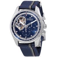 Silver-tone stainless steel case with a blue nylon strap. Fixed silver-tone stainless steel bezel. Blue (open heart) dial with luminous silver-tone hands and index hour markers. Minute markers. Tachymeter markings around the outer rim. Dial Type: Analog. Luminescent hands and markers. Chronograph - two sub-dials displaying: 12 hour and 30 minute. Zenith Calibre El Primero 4061 Automatic movement, based upon Zenith El Primero 400, containing 31 Jewels, composed of 282 parts, bitting at 36000 vph, and has a power reserve of approximately 50 hours. Scratch resistant sapphire crystal. Pull / push crown. Transparent case back. Round case shape, case size: 42 mm, case thickness: 14.05 mm. Band width: 21 mm. Butterfly with push button release clasp. Water resistant at 100 meters / 330 feet. Functions: chronograph, column wheel, hour, minute, small second, tachymeter. El Primero Series. Luxury watch style. Watch label: Swiss Made. Zenith Chronomaster Chronograph Automatic Watch 03.20416.4061/51.C802. CASE Case Size: 42 Case Thickness: 14.05 mm Case Material: Stainless Steel Case Shape: Round Case Back: Transparent BAND Band Material: Nylon Band Type: Strap Band Color: Blue Band Width: 21 mm Clasp: Butterfly with Push Button Release DIAL Dial Color: Blue (Open Heart) Type: Analog Crystal: Scratch Resistant Sapphire Hands: Luminous Silver-tone Dial Markers: Index Second Markers: Minute Markers. Tachymeter Markings around the outer rim Sub Dials: Two - 12 Hour and 30 Minute Luminiscence: Hands and Markers Bezel: Fixed Bezel Color: Silver-tone Bezel Material: Stainless Steel Crown: Pull / Push INFORMATION Brand: Zenith Series: El Primero Collection Name: El Primero Gender: Mens Model: 03.20416.4061/51.C802 Watch Label: Swiss Made Movement: Automatic Engine: Zenith Calibre El Primero 4061 Power Reserve: 50 hours FEATURES Water Resistance: 100 meters / 330 feet Functions: Chronograph, Column Wheel, Hour, Minute, Small Second, Tachymeter Watch Features: Chronograph, Stainless Steel, Analog ADDITIONAL INFO Watch Style: Luxury Warranty: 3 Year Jomashop Warranty Jomashop Sku: ZE0320416406151C802 Department: Watches Category: Watches