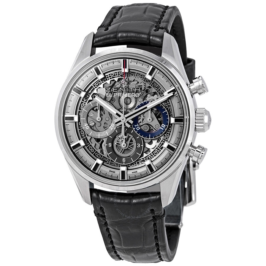 Silver-tone stainless steel case with a black (alligator) leather with protective rubber lining strap. Fixed silver-tone stainless steel bezel. Skeleton dial with luminous silver-tone hands and index hour markers. Date scale. minute markers around the outer rim. Dial Type: Analog. Luminescent hands and markers. Date display between 4 and 5 o'clock position. Chronograph - three sub-dials displaying: 60 second, 30 minute and 12 hours. Zenith Calibre El Primero 400 Automatic movement, containing 31 Jewels, composed of 278 parts, bitting at 36000 vph, and has a power reserve of approximately 50 hours. Scratch resistant sapphire crystal. Pull / push crown. Transparent case back. Round case shape, case size: 38 mm, case thickness: 12.45 mm. Band width: 19 mm. Tang clasp. Water resistant at 100 meters / 330 feet. Functions: moon phase, chronograph, column wheel, date, hour, minute, small second. Additional Info: 31 jewels. Luxury watch style. Watch label: Swiss Made. Zenith Chronomaster El Primero Full Open Skeleton Dial Automatic Men's Leather Watch 03.2153.400/78.C813. CASE Case Size: 38 Case Thickness: 12.45 mm Case Material: Stainless Steel Case Shape: Round Case Back: Transparent BAND Band Material: (Alligator) Leather with Protective Rubber Lining Band Type: Strap Band Color: Black Band Width: 19 mm Clasp: Tang DIAL Dial Color: Skeleton Type: Analog Crystal: Scratch Resistant Sapphire Hands: Luminous Silver-tone Dial Markers: Index Second Markers: Date Scale. Minute Markers around the outer rim Sub Dials: Three - 60 Second, 30 Minute and 12 Hour Luminiscence: Hands and Markers Bezel: Fixed Bezel Color: Silver-tone Bezel Material: Stainless Steel Crown: Pull / Push INFORMATION Brand: Zenith Series: Chronomaster El Primero Full Open Collection Name: Chronomaster El Primero Full Open Gender: Mens Model: 03.2153.400/78.C813 Watch Label: Swiss Made Movement: Automatic Engine: Zenith Calibre El Primero 400 Power Reserve: 50 hours FEATURES Water Resistance: 100 meters / 330 feet Calendar: Date display between 4 and 5 o'clock position Functions: Moon Phase, Chronograph, Column Wheel, Date, Hour, Minute, Small Second Watch Features: Alligator Leather, Analog, Leather, Rubber, Stainless Steel, Moon Phase, Chronograph ADDITIONAL INFO Watch Style: Luxury Warranty: 3 Year Jomashop Warranty UPC Code: 7613061026990 Additional Info: 31 jewels Jomashop Sku: ZE03215340078C813 Department: Watches Category: Watches