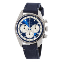 Silver-tone stainless steel case with a blue calfskin leather strap. Fixed silver-tone stainless steel bezel. Blue dial with silver-tone hands and index hour markers. Minute scale around the inner rim. Dial Type: Analog. Date display between 4 and 5 o'clock position. Chronograph - three sub-dials displaying: 60 second, 60 minute and 1/10th of a second. Zenith Calibre El Primero 3600 Automatic movement, containing 35 Jewels, composed of 311 parts, bitting at 36000 vph, and has a power reserve of approximately 60 hours. Scratch resistant sapphire crystal. Transparent see through case back. Round case shape, case size: 38 mm. Folding clasp. Water resistant at 50 meters / 165 feet. Functions: chronograph, column wheel, date, hour, minute, small second, chronometer. Chronomaster Original Series. Luxury watch style. Watch label: Swiss Made. Zenith Chronomaster Original Chronograph Automatic Chronometer Blue Dial Men's Watch 03.3200.3600/51.C902. INFORMATION Brand: Zenith Series: Chronomaster Original Collection Name: Chronomaster Original Gender: Mens Model: 03.3200.3600/51.C902 Watch Label: Swiss Made Movement: Automatic Engine: Zenith Calibre El Primero 3600 Power Reserve: 60 hours CASE Case Size: 38 mm Case Material: Stainless Steel Case Shape: Round Case Back: Transparent See Through BAND Band Material: Calfskin Leather Band Type: Strap Band Color: Blue Clasp: Folding DIAL Dial Color: Blue Type: Analog Crystal: Scratch Resistant Sapphire Hands: Silver-tone Dial Markers: Index Second Markers: Minute Scale around the inner rim Sub Dials: Three - 60 Second, 60 Minute and 1/10th of a Second Bezel: Fixed Bezel Color: Silver-tone Bezel Material: Stainless Steel FEATURES Water Resistance: 50 meters / 165 feet Calendar: Date display between 4 and 5 o'clock position Functions: Chronograph, Column Wheel, Date, Hour, Minute, Small Second, Chronometer Watch Features: Chronograph, Stainless Steel, Leather, Chronometer, Analog ADDITIONAL INFO Watch Style: Luxury Warranty: 3 Year Jomashop Warranty Jomashop Sku: ZE033200360051C902 Department: Watches Category: Watches