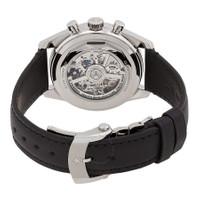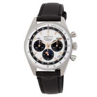 Silver-tone stainless steel case with a black leather strap. Fixed silver-tone stainless steel bezel. Silver opaline dial with rose gold-tone hands and index hour markers. Minute markers around the outer rim. Dial Type: Analog. Luminescent hands and markers. Date display between 4 and 5 o'clock position. Chronograph - three sub-dials displaying: 60 second, 60 minute and small second. El Primero 3610 automatic movement with a 60-hour power reserve. Scratch resistant sapphire crystal. Transparent case back. Round case shape, case size: 38 mm. Water resistant at 50 meters / 165 feet. Functions: chronograph, day, date, month, hour, minute, small second, moonphase. Chronomaster Original Triple Calendar Series. Luxury watch style. Watch label: Swiss Made. Zenith Chronomaster Original Triple Calendar Automatic Silver Dial Watch 03.3400.3610/38.C911. INFORMATION Brand: Zenith Series: Chronomaster Collection Name: Chronomaster Gender: Mens Model: 03.3400.3610/38.C911 Watch Label: Swiss Made Movement: Automatic Engine: El Primero 3610 Power Reserve: 60 hours CASE Case Size: 38 mm Case Material: Stainless Steel Case Shape: Round Case Back: Transparent BAND Band Material: Leather Band Type: Strap Band Color: Black DIAL Dial Color: Silver opaline Type: Analog Crystal: Scratch Resistant Sapphire Hands: Rose Gold-tone Dial Markers: Index Second Markers: Minute Markers around the outer rim Sub Dials: Three - 60 Second, 60 Minute and Small Second Luminiscence: Hands and Markers Bezel: Fixed Bezel Color: Silver-tone Bezel Material: Stainless Steel FEATURES Water Resistance: 50 meters / 165 feet Calendar: Date display between 4 and 5 o'clock position Functions: Chronograph, Day, Date, Month, Hour, Minute, Small Second, Moonphase Watch Features: Chronograph, Stainless Steel, Leather, Gold, Month, Analog ADDITIONAL INFO Watch Style: Luxury Warranty: 3 Year Jomashop Warranty Jomashop Sku: ZE033400361038C911 Department: Watches