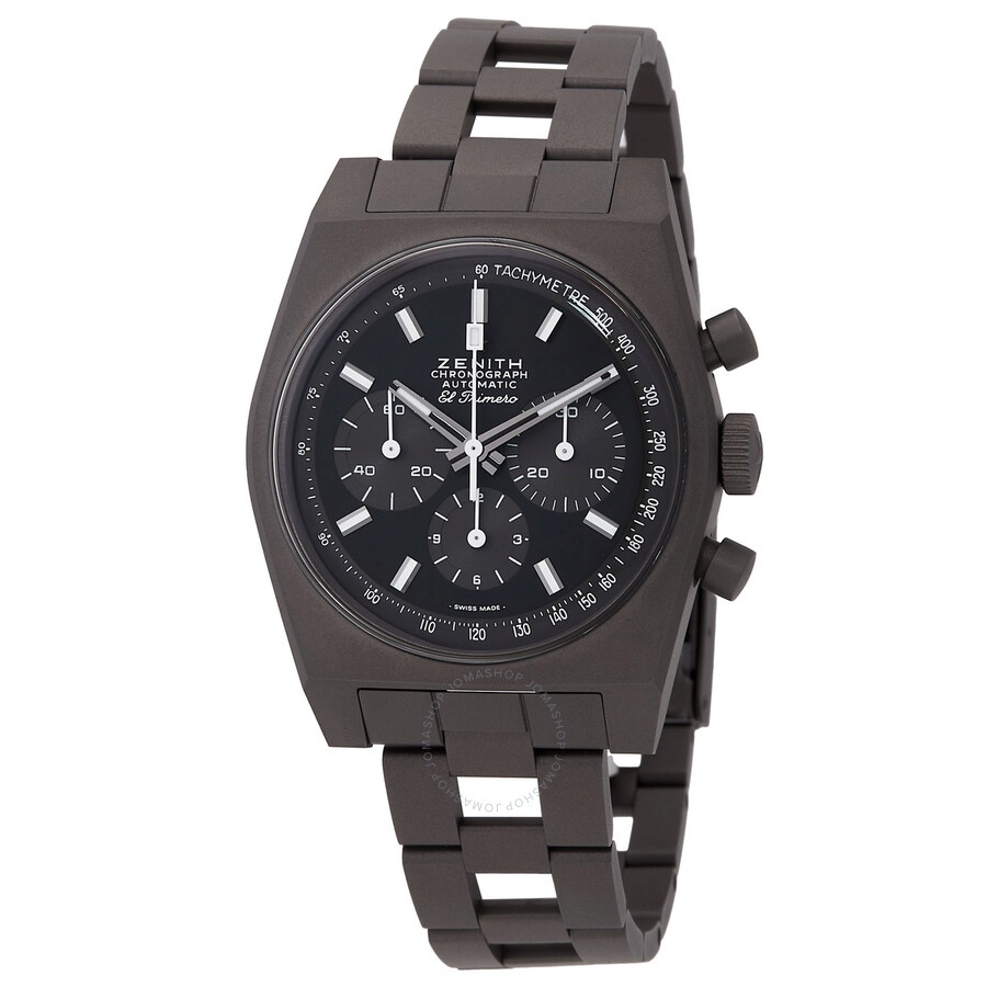 Matte microblasted titanium case and bracelet. Fixed matte microblasted titanium bezel. Black dial with index hour markers. Tachymeter markers around the outer rim. Dial Type: Analog. Luminescent hands and markers. Chronograph - three sub-dials displaying: 60 second, 30 minute and 12 hours. Zenith Calibre El Primero 400 Automatic movement, containing 31 Jewels, composed of 278 parts, bitting at 36000 vph, and has a power reserve of approximately 50 hours. Scratch resistant sapphire crystal. Pull / push crown. Transparent case back. Round case shape, case size: 37 mm, case thickness: 12.6 mm. Folding clasp. Water resistant at 50 meters / 165 feet. Functions: chronograph, hour, minute, second. Chronomaster Revival Shadow Series. Luxury watch style. Watch label: Swiss Made. Zenith Chronomaster Revival Shadow Chronograph Automatic Black Dial Men's Watch 97.T384.4061/21.M384. GENERAL Box Type: Original Box CASE Case Size: 37 Case Thickness: 12.6 mm Case Material: Matte Microblasted Titanium Case Shape: Round Case Back: Transparent BAND Band Material: Matte Microblasted Titanium Band Type: Bracelet Clasp: Folding DIAL Dial Color: Black Type: Analog Crystal: Scratch Resistant Sapphire Dial Markers: Index Second Markers: Tachymeter Markers around the outer rim Sub Dials: Three - 60 Second, 30 Minute and 12 Hours Luminiscence: Hands and Markers Bezel: Fixed Bezel Material: Matte Microblasted Titanium Crown: Pull / Push INFORMATION Brand: Zenith Series: Chronomaster Revival Shadow Collection Name: Chronomaster Revival Shadow Gender: Mens Model: 97.T384.4061/21.M384 Watch Label: Swiss Made Movement: Automatic Engine: Zenith Calibre El Primero 400 Power Reserve: 50 hours FEATURES Water Resistance: 50 meters / 165 feet Functions: Chronograph, Hour, Minute, Second Watch Features: Analog, Titanium, Chronograph ADDITIONAL INFO Watch Style: Luxury Warranty: 3 Year Jomashop Warranty Jomashop Sku: ZE97T384406121M384 Department: Watches