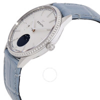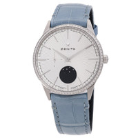 Silver-tone stainless steel case with a jean blue alligator leather strap. Fixed bezel with diamond set. Silver sunburst-pattern dial with silver-tone hands and index hour markers. Dial Type: Analog. One subdial displaying: one- small seconds. Zenith Calibre 692 automatic movement with a 50-hour power reserve. Scratch resistant sapphire crystal. Pull / push crown. Round case shape, case size: 36 mm. Water resistant at 50 meters / 165 feet. Functions: hour, minute, second, moonphase. Elite Series. Luxury watch style. Watch label: Swiss Made. Zenith Elite Automatic Diamond Ladies Watch 16.3200.692/01.C832. GENERAL Box Type: Original Box CASE Case Diameter: 36 Case Material: Stainless Steel Case Shape: Round BAND Band Material: Alligator Leather Band Type: Strap Band Color: Jean Blue DIAL Dial Color: Silver Sunburst-Pattern Type: Analog Crystal: Scratch Resistant Sapphire Hands: Silver-tone Dial Markers: Index Sub Dials: One- Small Seconds Bezel: Fixed Bezel Material: Diamond Set Crown: Pull / Push INFORMATION Brand: Zenith Series: Elite Collection Name: Elite Gender: Womens Model: 16.3200.692/01.C832 Watch Label: Swiss Made Movement: Automatic Engine: Zenith Calibre 692 Power Reserve: 50 hours FEATURES Water Resistance: 50 meters / 165 feet Functions: Hour, Minute, Second, Moonphase Watch Features: Alligator Leather, Analog, Leather, Stainless Steel, Diamond ADDITIONAL INFO Watch Style: Luxury Warranty: 3 Year Jomashop Warranty Jomashop Sku: ZE16320069201C832 Department: Watches Category: Watches