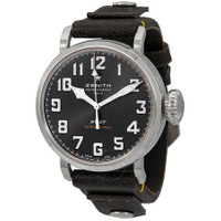 Silver-tone stainless steel case with a black (aged calfskin) leather strap. Fixed silver-tone stainless steel bezel. Slate grey (sunray pattern) dial with luminous silver-tone hands and Arabic numeral hour markers. Minute markers around the outer rim. Dial Type: Analog. Luminescent hands and markers. Zenith Calibre Elite automatic movement with a 50-hour power reserve. Scratch resistant sapphire crystal. Pull / push crown. Solid case back. Round case shape, case size: 45 mm, case thickness: 12.95 mm. Band width: 20 mm. Tang clasp. Water resistant at 100 meters / 330 feet. Functions: hour, minute, second. Pilot Type 20 Series. Luxury watch style. Watch label: Swiss Made. Zenith Pilot Type 20 Automatic Men's Watch 03.2434.679/20.I010. CASE Case Size: 45 Case Thickness: 12.95 mm Case Material: Stainless Steel Case Shape: Round Case Back: Solid BAND Band Material: (Aged Calfskin) Leather Band Type: Strap Band Color: Black Band Width: 20 mm Clasp: Tang DIAL Dial Color: Slate Grey (Sunray Pattern) Type: Analog Crystal: Scratch Resistant Sapphire Hands: Luminous Silver-tone Dial Markers: Arabic Numeral Second Markers: Minute Markers around the outer rim Luminiscence: Hands and Markers Bezel: Fixed Bezel Color: Silver-tone Bezel Material: Stainless Steel Crown: Pull / Push INFORMATION Brand: Zenith Series: Pilot Type 20 Collection Name: Pilot Type 20 Gender: Mens Model: 03.2434.679/20.I010 Watch Label: Swiss Made Movement: Automatic Engine: Zenith Calibre Elite Power Reserve: 50 hours FEATURES Water Resistance: 100 meters / 330 feet Functions: Hour, Minute, Second Watch Features: Stainless Steel, Leather, Analog ADDITIONAL INFO Watch Style: Luxury Warranty: 3 Year Jomashop Warranty Jomashop Sku: ZE03243467920I010 Department: Watches Category: Watches
