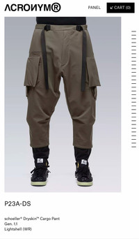 Full pack included Very good condition - owned briefly(first owner) and only worn a handful of times. P23A is a wide cut, drop crotch, drawcord waist trouser with 4 detached entry cargo pockets and a layered low profile cuff. Ǎcronymř pattern science means optimal motion. DEEPæ pockets mean optimal storage. Beltless drawcord waist cinches down from oversize. S = +30. M = +32. L = +34. XL = +36 The remarkable properties of schoeller® 3XDRY® Dryskin™ fabric make this P23 one of the most versatile and effortless yet. [ Shown in size: M. Fits: WIDE ] Fabric technology * schoeller® 3XDRY® DRYSKIN™ (205 g/m²) * (91% PA, 9% EL) * Fabric made in Switzerland Sizing Size XS S M L XL 1/2 Waist 46 49 52 55 58 1/2 Hem 12 12,5 13 13,5 14 Inseam 65 67,5 70 72,5 75 Outseam 95 98 101 104 107 All measurements in centimeters. Weight: 635g (size M, color Black) Subsystems Deep Pocketsǽ Pockets: 12 _External: 9 _Internal: 3