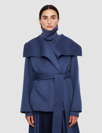 The Adrienne Double Face Cashmere Jacket is a relaxed fit, short wrap jacket, crafted from a blend of wool and cashmere. This piece is lightweight with a soft hand feel, featuring an oversized collar which can be worn open or closed for a high neck look. - Designed for a relaxed fit - Short wrap style - Oversized collar - Side pockets - Removable belt - Product code: jf0089891403 - Harbour Blue SIZE ADVICE - Model wears size FR 36/UK 8/EU 34/US 4/DE 34/IT 40/JP 7 CARE & MATERIALS Discover the Care Guide, a guide to help you to care for your garments. - 80% Wool 20% Cashmere - No washing - No bleach - No tumble dry - Iron low temperature setting - Dry clean The Responsible Wool Standard is guaranteeing animal welfare, land management and social requirements on the entire supply chain, from wool farmer to Joseph. This standard is backed up by independent certification. Certified by Ecocert Greenlife, certification N° 272512 JOSEPH LIMITED.