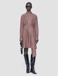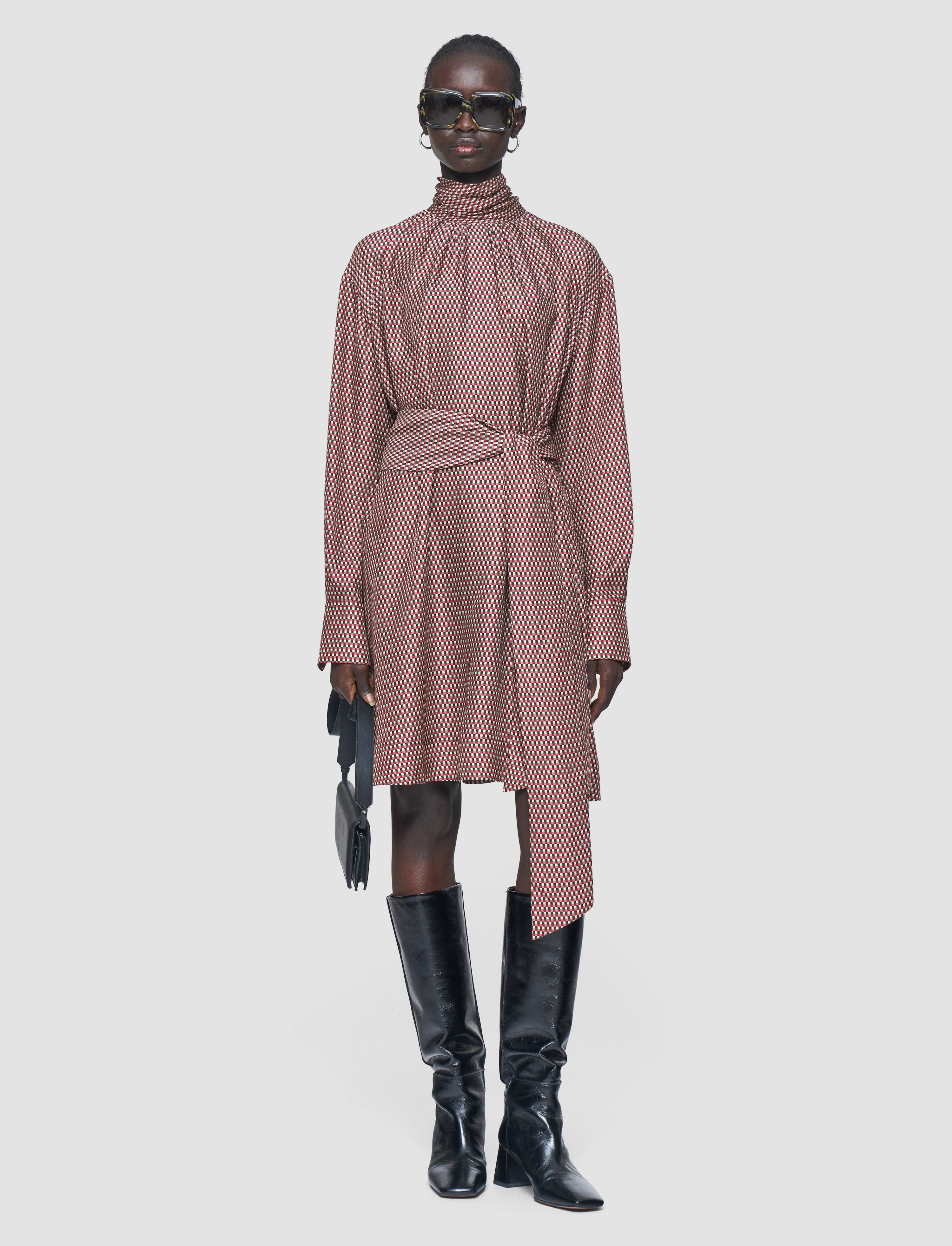 The Agata Printed Silk Blend Dress is a flared, knee length dress, crafted from a silk blend. This dress features a contemporary checked print. It has an elegant gathered high neck and a removable tie belt for versatile styling, letting you define your silhouette with ease. Model wears size FR 38/UK 10/EU 36/US 6/DE 36/IT 42/JP 9 Details - Flared - Knee length - Gathered high neck - Tie belt - Invisible back zip - Product code: jf0094360644 Care & Materials - 28% Silk 72% Tencel - Gentle hand wash - Do not bleach - Do not tumble dry - Iron low temperature setting - Dry clean