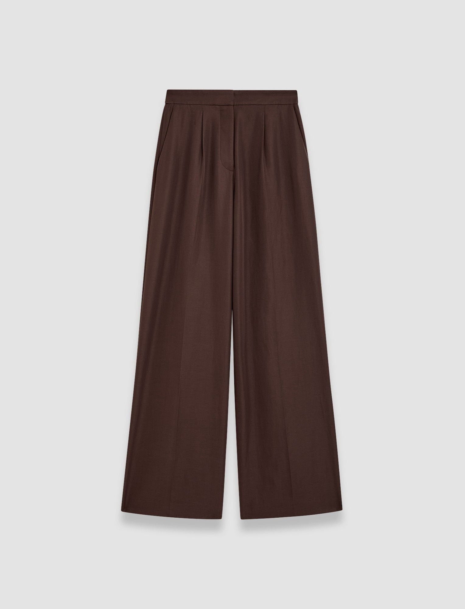 The Alanel Soft Cotton Silk Trousers are a high-rise, wide leg trouser. Crafted from silk and cotton, the fabric has a natural sheen and a silky-smooth hand feel. These trousers are lightweight and offer a relaxed look. They feature an elasticated waistband at the back for comfortable, easy wear. - Soft, unstructured tailoring - Wide leg - High-rise - Full-length - Front pleat - Side pockets - Elasticated waistband at the back - Lightweight - Product code: jf0091280167 - Ebony Brown SIZE ADVICE - Regular outer leg length 113cm - 116cm - Shorter outer leg length 102cm - 105cm - Model wears size FR 36/UK 8/EU 34/US 4/DE 34/IT 40/JP 7 CARE & MATERIALS Discover the Care Guide, a guide to help you to care for your garments. - 52% Silk 48% Cotton - Do not wash - Do not bleach - Do not tumble dry - Iron low temperature setting - Dry clean