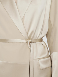 The Amelia Shiny Matte Satin Jacket is a relaxed fit, double-breasted jacket, crafted from smooth, lustrous silk. This lightweight style is made up of a luxurious combination of shiny and matte silk, for an elegant suiting aesthetic. - Designed for a relaxed fit - Double-breasted - Front flap pockets - Removable belt - Lined - Product code: jf0090921267 - Quail Beige SIZE ADVICE - Model wears size FR 36/UK 8/EU 34/US 4/DE 34/IT 40/JP 7 CARE & MATERIALS Discover the Care Guide, a guide to help you to care for your garments. - 100% Silk - Do not wash - Do not bleach - Do not tumble dry - Iron low temperature setting - Dry clean