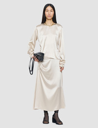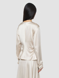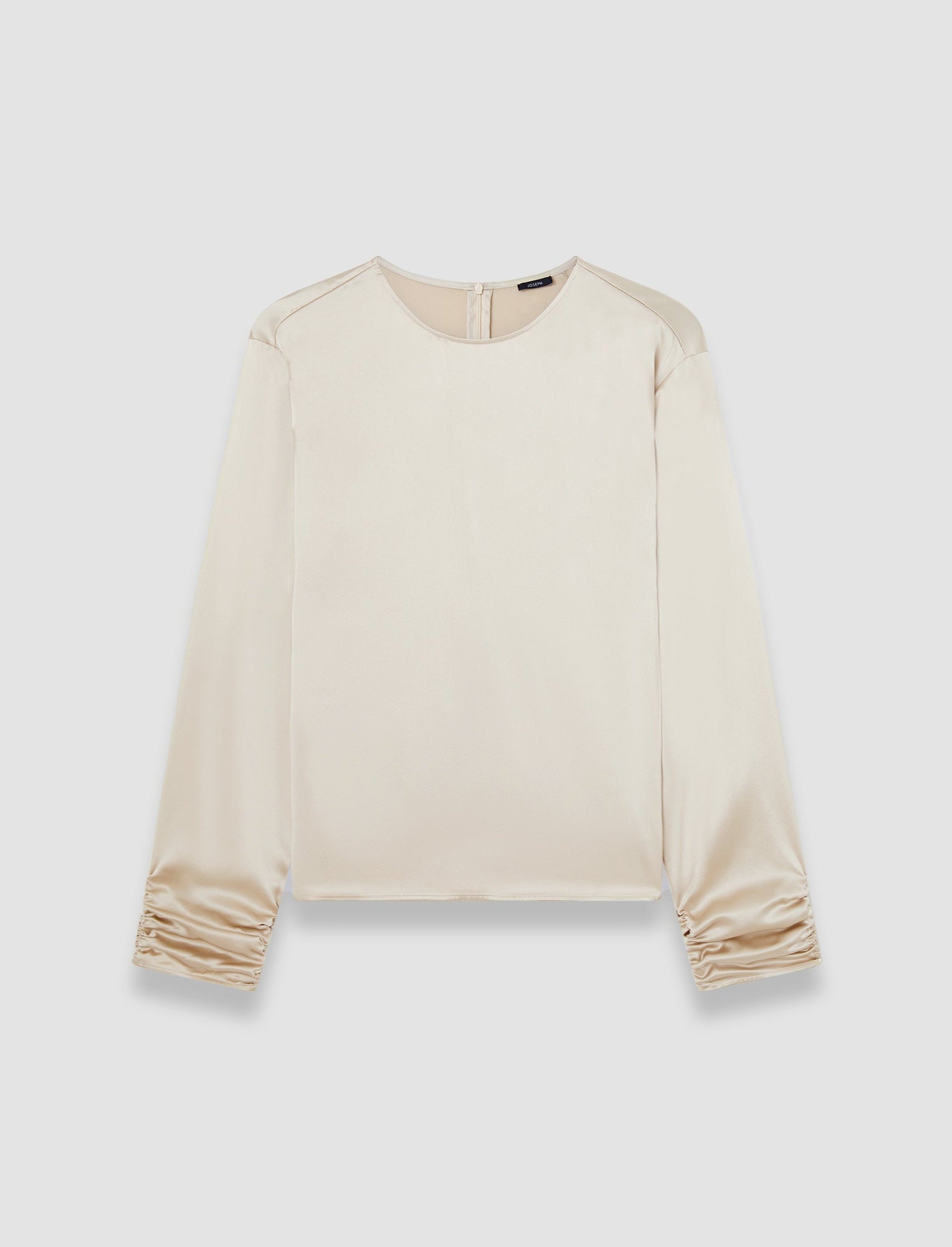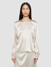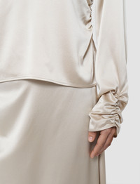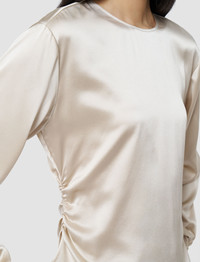 The Anna Ruched Silk Satin Blouse is a relaxed fit blouse, crafted from a luxurious, lustrous silk. This style has a classic round neckline and slightly dropped shoulders for an effortless look. It features ruched detailing down the sides and on each cuff. - 100% silk - Designed for a relaxed fit - Ruched detailing - Invisible back zip - Product code: jf0092341267 - Quail Beige SIZE ADVICE - Model wears size FR 36/UK 8/EU 34/US 4/DE 34/IT 40/JP 7 CARE & MATERIALS - 100% Silk - Machine wash, delicate program wash, very gentle spin - Do not bleach - Do not tumble dry - Iron low temperature setting - Dry clean - Use a mild detergent - Put in a laundry bag - Hang to dry - Wash inside out with similar colours - Iron inside out