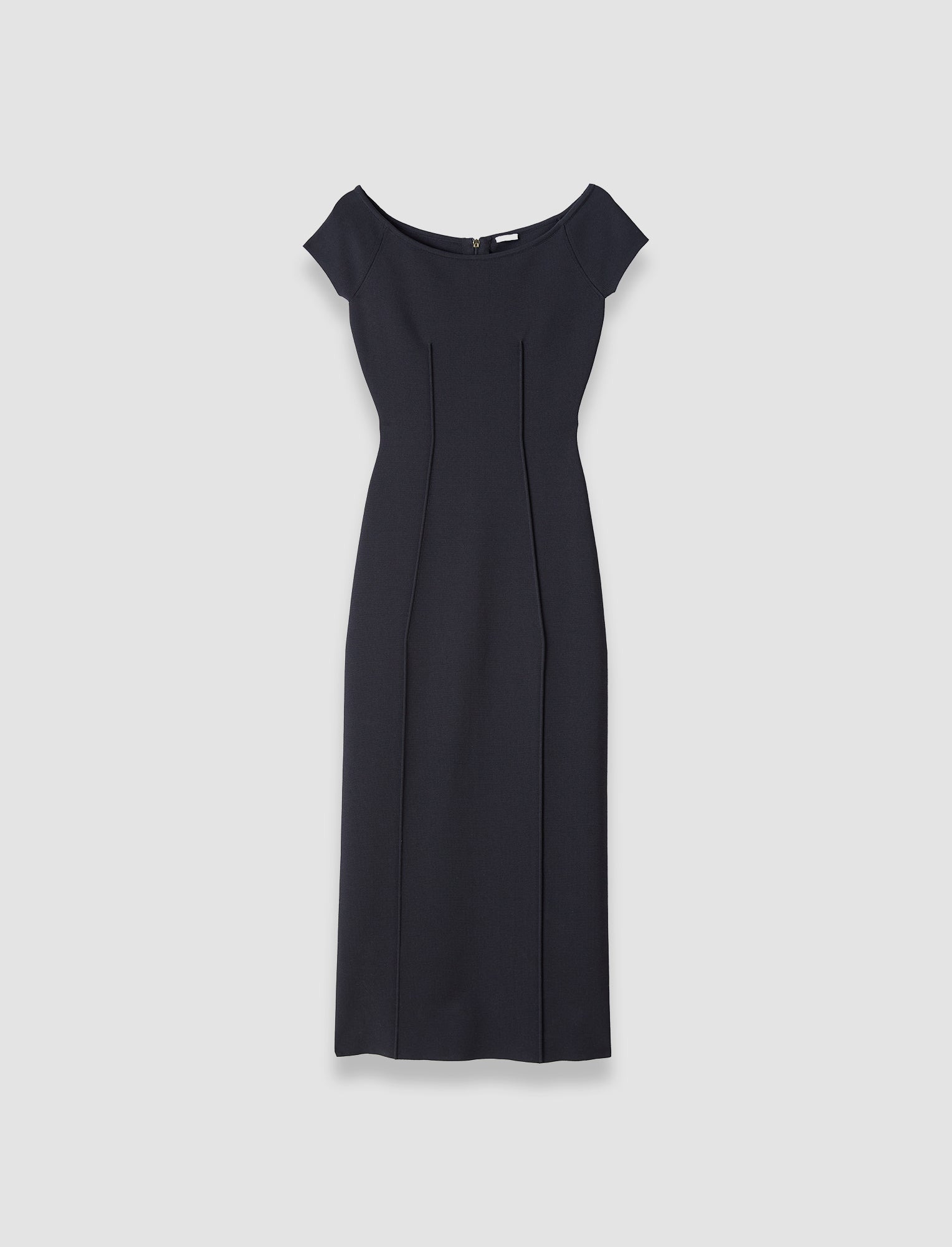 The Foin Compact Milano Knit Dress is a slim fit, ankle length dress. Crafted from a stretchy viscose blend, a compact, mid-weight knit which adapts to the shape of the body. Elegant and clean cut, it's finished with a boat neckline and a pintuck detailing down the front. Model wears size S Details - Designed for a slim fit - Ankle length - Boat neckline - Gold-tone back zip - Pintuck detailing - Stretchy - Product code: jf0095330010 Care & Materials - 60% Viscose 19% Polyamide 18% Polyester 3% Elastane - Do not wash - Do not bleach - Do not tumble dry - Iron at a maximum temperature of 110℃ without steam - Hydrocarbons professional dry cleaning - Clean and iron inside out - Cover trims with fabric cover for cleaning - Dry flat