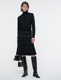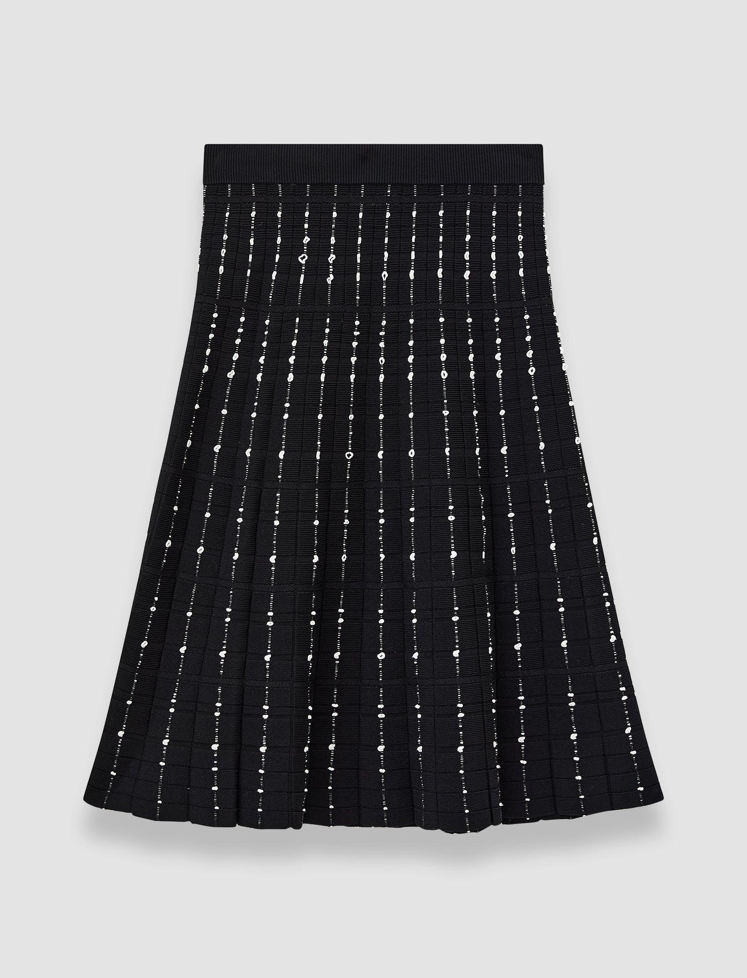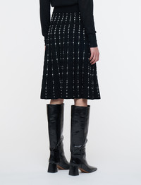 The Fragmented Stripes Knee Length Skirt is a flared knitted skirt, crafted from a viscose blend. This elegant style features a contrasting dotted, stripe pattern. Its compact, ribbed knit design provides a flattering weight and drape. Model wears size S Details - Flared - Below the knee - Elasticated waistband - Stretch - Product code: jf0094741906 Care & Materials - 80% Viscose 17% Elastane 2% Cotton 1% Polyester - Machine wash, hand wash cycle, wool/silk program, very gentle spin - Do not bleach - Do not tumble dry - Iron low temperature setting - Dry clean - Use a wool shampoo - Put in a laundry bag - Wash inside out with similar colours - Dry flat - Iron inside out