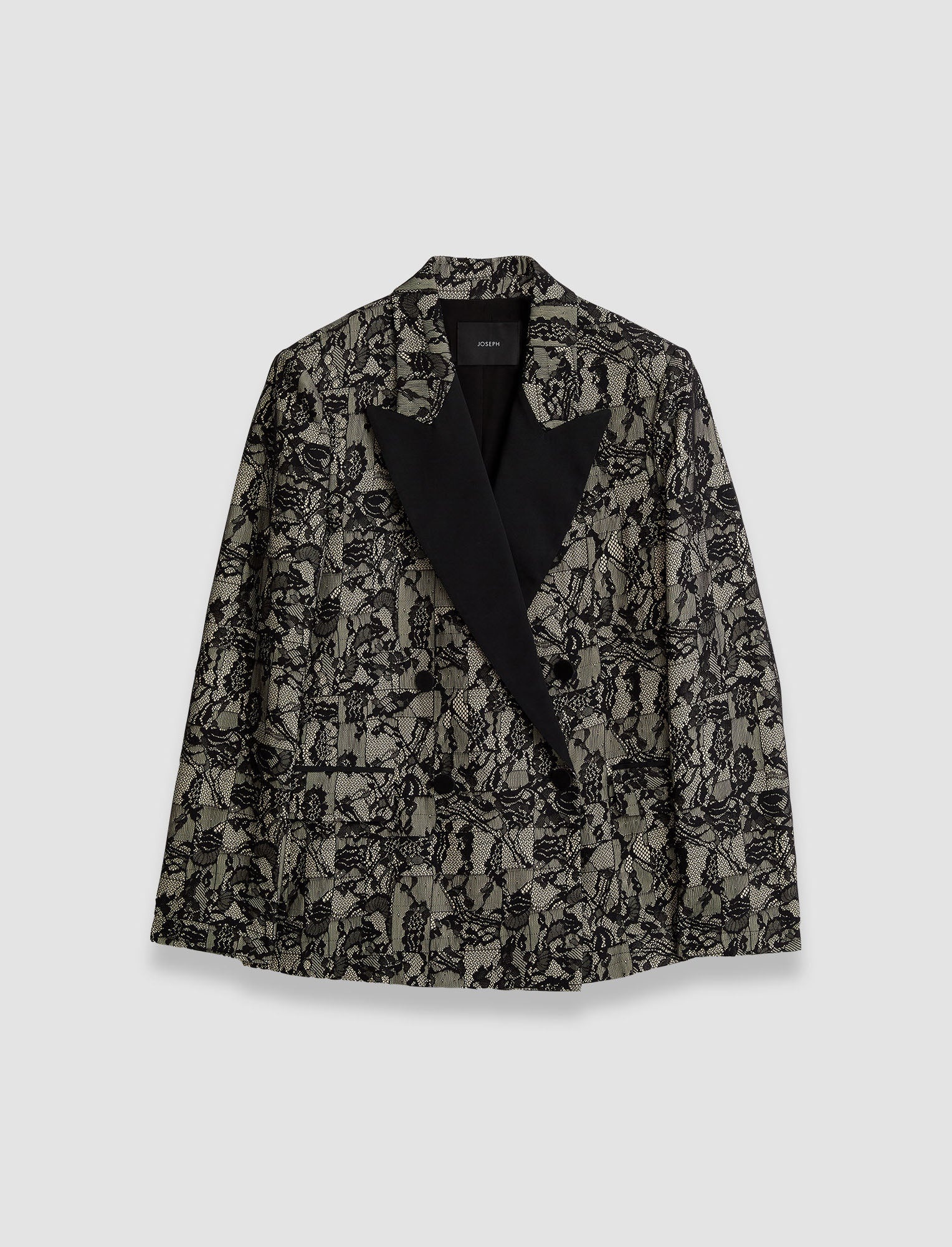 The Jaden Patchwork Lace Jacket is a regular fit, double-breasted jacket, crafted from a silk blend. Precious, modern-look lace is reimagined in a deconstructed patchwork pattern. The lace is designed by JOSEPH and developed alongside a specialist Italian mill. This eveningwear jacket is fluid and finished with shoulder padding. - Designed for a regular fit - Double-breasted - Side pockets - Lined - Product code: jp0016941104 - Comet Combo Black SIZE ADVICE - Model wears size FR 36/UK 8/EU 34/US 4/DE 34/IT 40/JP 7 CARE & MATERIALS - 88% Acetate 12% Silk - Do not wash - Do not bleach - Do not tumble dry - Iron low temperature setting - Dry clean