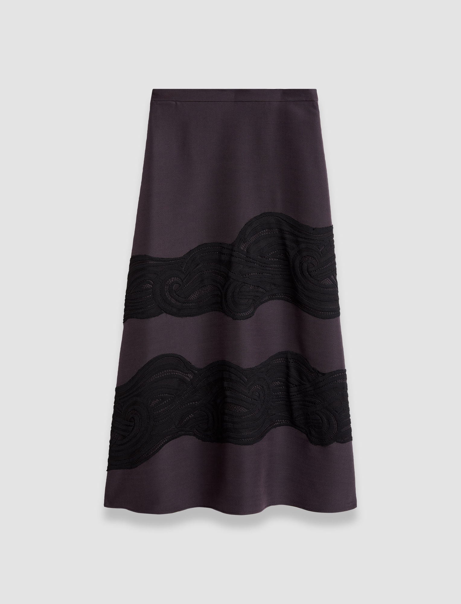 The Madone Evening Silk Blend & Lace Skirt is a flared, A-line skirt. Crafted from a smooth wool and silk blend gazar, which offers a luxurious, tailoring feel. This style features lace detailing which has been hand cut following the lines of this lace. The lace pattern has been exclusively designed for JOSEPH; it has been finished with embroidery creating an intricate, textured lace. - A-line - Mid-rise - Mid-length - Hand cut lace detailing - Invisible side zip - Product code: jf0088760572 - Aurora Purple SIZE ADVICE - Model wears size FR 36/UK 8/EU 34/US 4/DE 34/IT 40/JP 7 CARE & MATERIALS Discover the Care Guide, a guide to help you to care for your garments. - 75% Wool 25% Silk - Do not wash - Do not bleach - Do not tumble dry - Iron low temperature setting - Dry clean