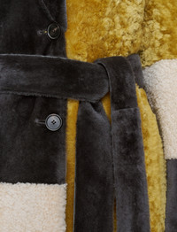 The Martel Overlay Shearling Coat is a relaxed, belted style crafted from supple, lightweight leather. This luxurious coat features a colour block design, expertly blending three distinct shearling textures: a short-pile, a wavy, and a curly variety. It delivers on comfort and warmth, while leaving room for layering. Model wears size FR 40/UK 12/EU 38/US 8/DE 38/IT 44/JP 11 Details - Designed for a relaxed fit - Single-breasted - Side pockets - Removable belt - Product code: jf0094430240 Care & Materials - 100% Sheepskin - Do not wash - Do not bleach - Do not iron - Do not tumble dry - Do not dry clean - Cleaning by a leather specialist only