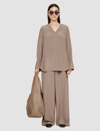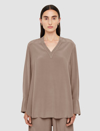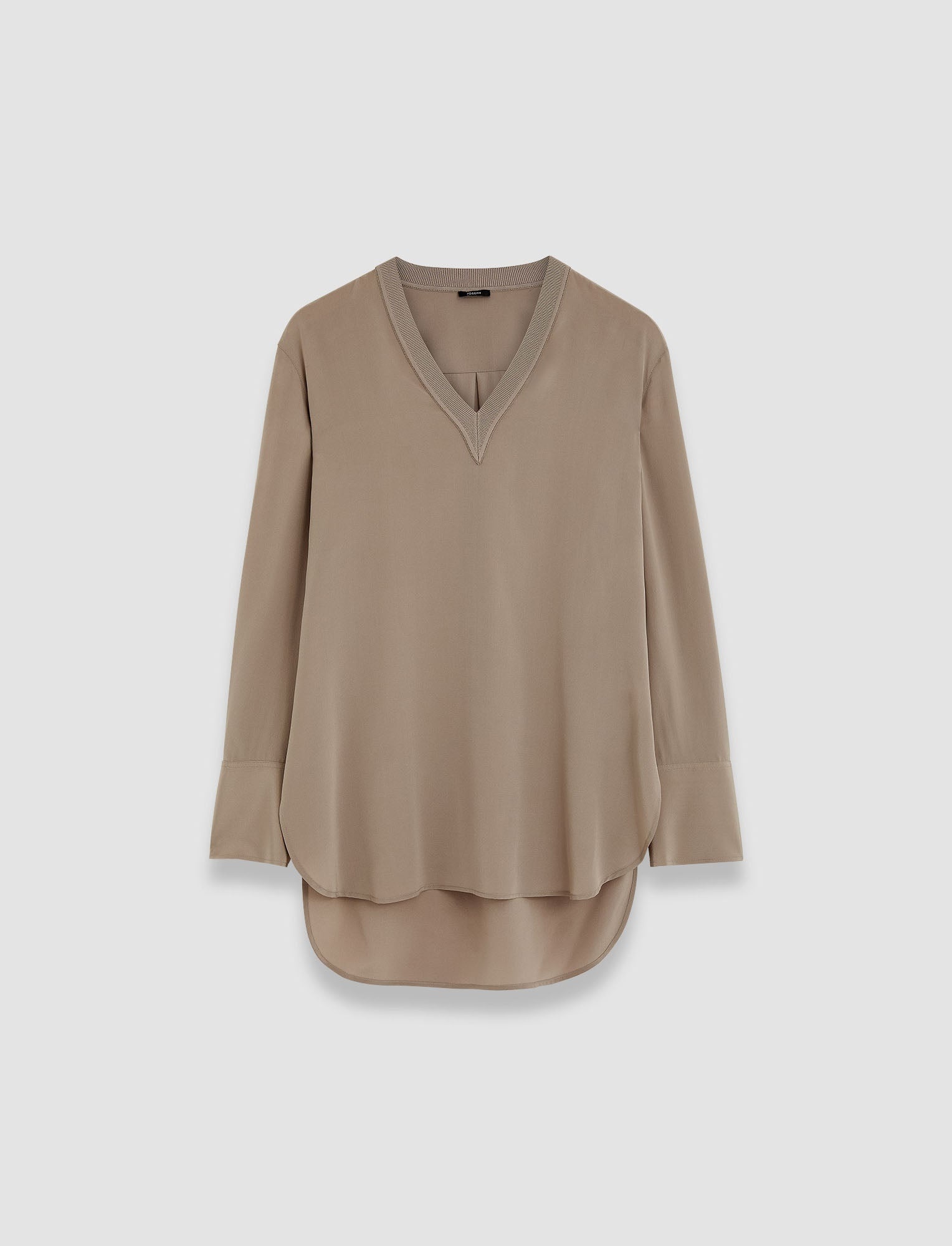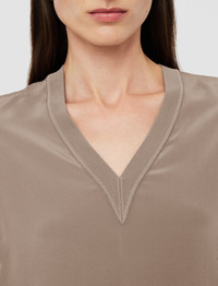 The Miller Crepe de Soie Silk Blouse is a relaxed fit, V neck blouse, crafted from a lightweight silk crepe. This effortless blouse is finished with a tonal, ribbed neckline. It has a curved step hemline for an easy-wearing silhouette, offering the option to easily tuck-in. - 100% silk - Designed for a relaxed fit - V neck - Tonal ribbed neckline - Wide cuffs - Curved, step hemline - Product code: jf0090711251 - Escargot Grey SIZE ADVICE - Model wears size FR 40/UK 12/EU 38/US 8/DE 38/IT 44/JP 11 CARE & MATERIALS Discover the Care Guide, a guide to help you to care for your garments. - 100% Silk - Machine wash, wool/silk program wash, very gentle spin - Do not bleach - Do not tumble dry - Iron low temperature setting - Dry clean - Use a special wool/silk detergent - Wash inside out with similar colours - Put in a laundry bag - Iron inside out - Hang to dry