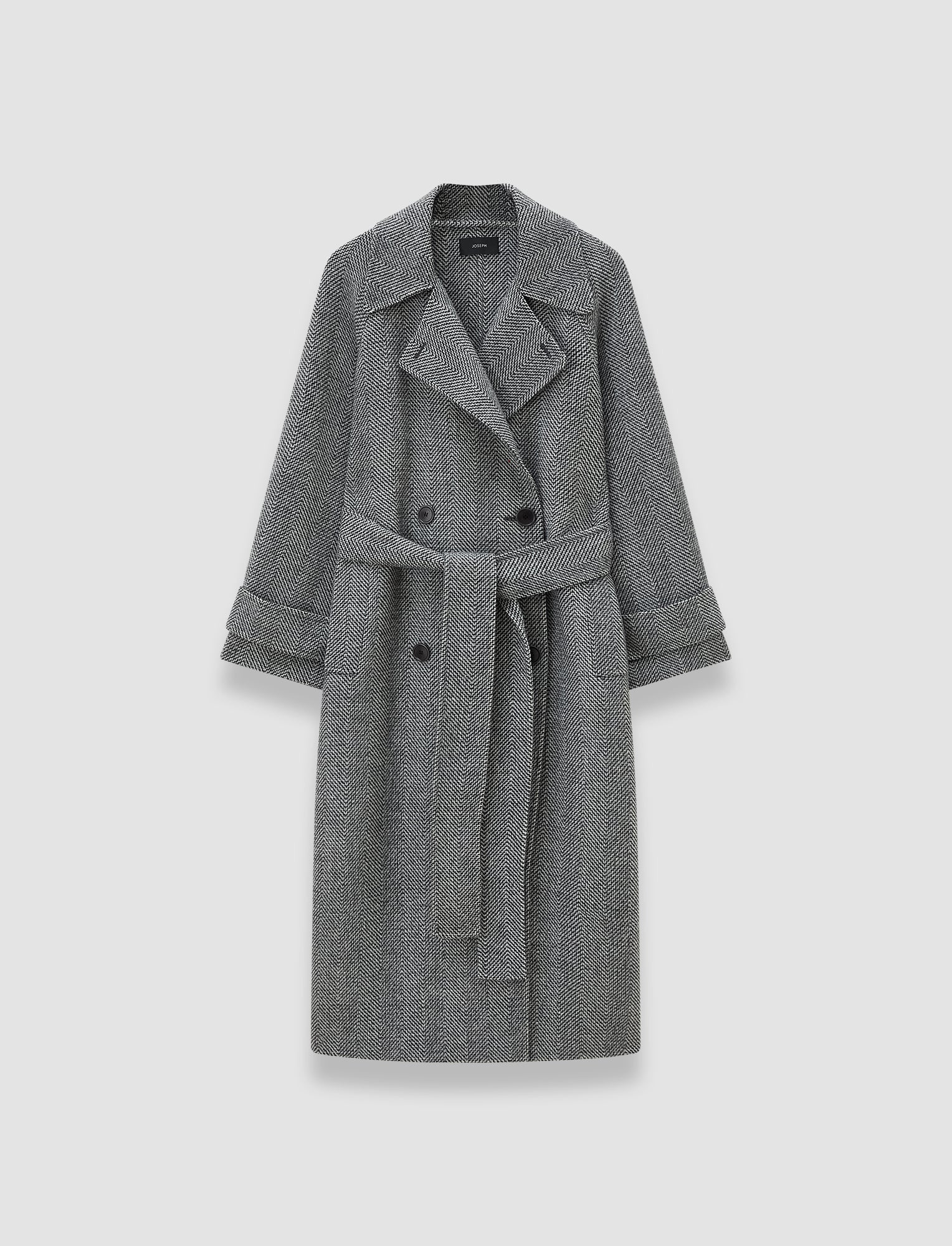 The Navarre Linear Double Face Wool is a relaxed fit coat, crafted from 100% virgin wool. This striking coat features an all-over herringbone pattern in contrasting tones. It's a double-breasted, trench coat inspired style, with lapels which can be worn open or fastened at the collar. Model wears size FR 36/UK 8/EU 34/US 4/DE 34/IT 40/JP 7 Details - We are recommending a size down - Designed for a relaxed fit - Double-breasted - Raglan sleeves - Removable belt - Buttoned collar - Side pockets - Adjustable cuff straps - Product code: jf0093971118 Care & Materials - 100% Virgin Wool - Do not wash - Do not tumble dry - Iron low temperature setting - Do not bleach - Dry clean