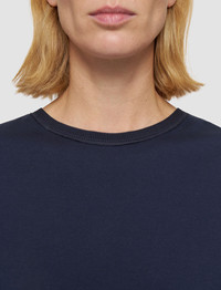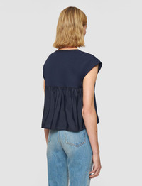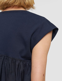 The Poplin Jersey T-Shirt is a relaxed fit, cropped style, crafted from 100% cotton. It features a contrasting back panel in poplin with ruching, adding subtle volume to the style. - Designed for a relaxed fit - Cropped - Cap sleeves - Contrasting back panel - Product code: jf0092140370 - Navy SIZE ADVICE - Model wears size FR 36/UK 8/EU 34/US 4/DE 34/IT 40/JP 7 CARE & MATERIALS - 100% Cotton - Machine wash, delicate program wash, very gentle spin - Do not bleach - Do not tumble dry - Iron low temperature setting - Dry clean - Use a mild detergent - Hang to dry - Wash inside out with similar colours - Iron on reverse