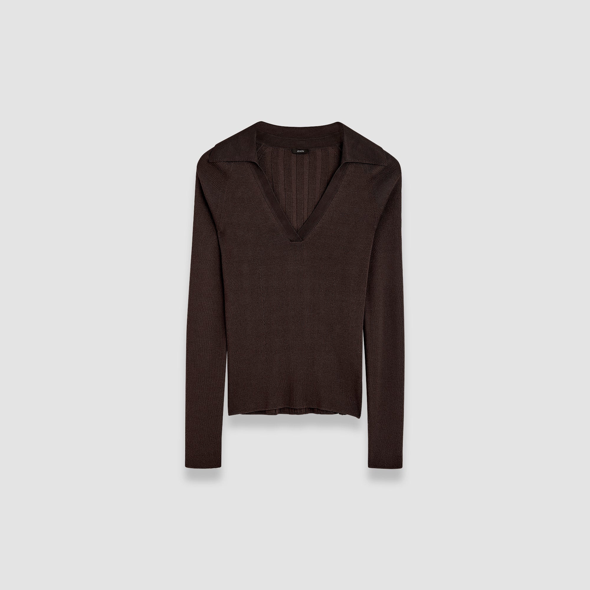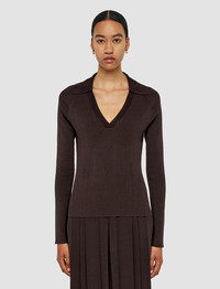 The Satiny Rib Knit Polo Top is a silm fit top, crafted from a viscose blend. Closely knitted together with a smooth hand feel, this effortless style features a contrasting, wide ribbed knit back and pointelle detailing at the waist. - Designed for a silm fit - Raglan sleeves - Wide ribbed back - Product code: jf0090390167 - Ebony Brown SIZE ADVICE - Model wears size S CARE & MATERIALS - 50% Viscose 45% Rayon 5% Polyester - Machine wash, wool/silk program wash, very gentle spin - Do not bleach - Do not tumble dry - Iron low temperature setting - Dry clean normal - Use a wool shampoo - Put in a laundry bag - Wash inside out with similar colours - Dry flat - Iron inside out