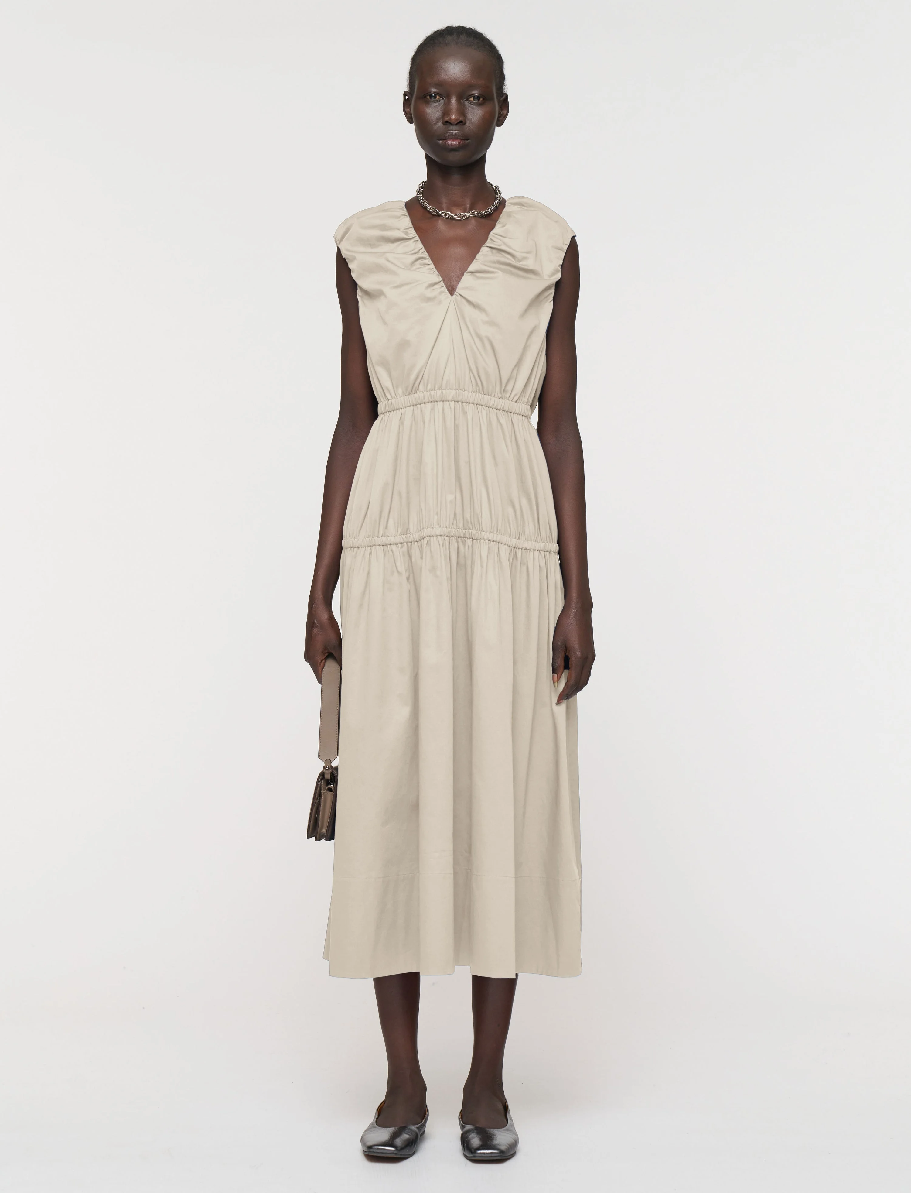 The Sembat Cotton Sateen Dress is a fit to flare dress, crafted from a durable cotton which has a smooth hand feel and a sheen finish. This style features elasticated gathering at the neckline, waist and hips, which creates an airy, voluminous look. Model wears size FR 36/UK 8/EU 34/US 4/DE 34/IT 40/JP 9 Details - 100% cotton - Mid-length - V neckline - Cap sleeves - Elasticated gathering at the waist and hips - Product code: jf0093682270 Care & Materials - 100% Cotton Do not wash Do not bleach Do not tumble dry Iron low temperature setting Dry clean
