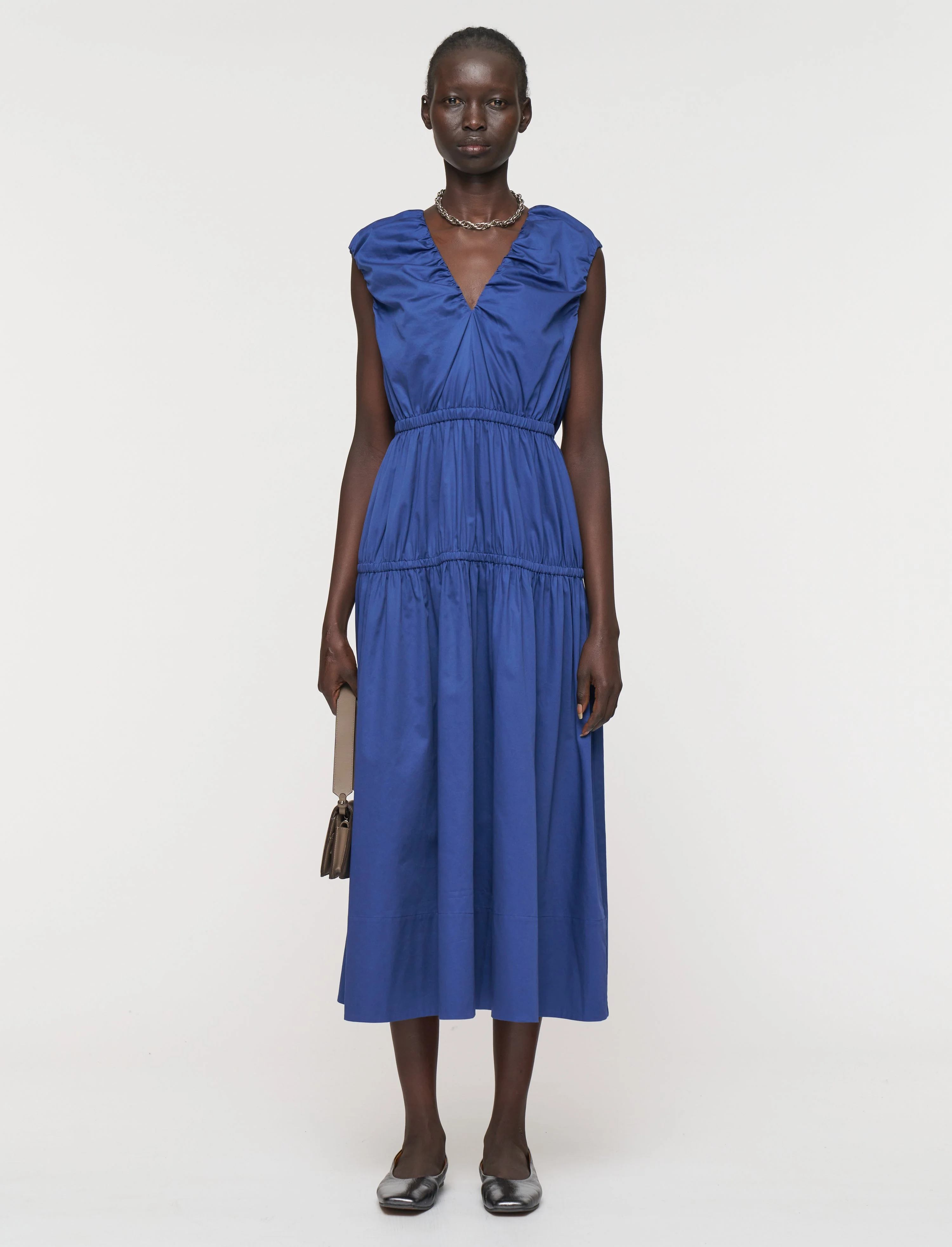 The Sembat Cotton Sateen Dress is a fit to flare dress, crafted from a durable cotton which has a smooth hand feel and a sheen finish. This style features elasticated gathering at the neckline, waist and hips, which creates an airy, voluminous look. Model wears size FR 36/UK 8/EU 34/US 4/DE 34/IT 40/JP 9 Details - 100% cotton - Mid-length - V neckline - Cap sleeves - Elasticated gathering at the waist and hips - Product code: jf0093681410 Care & Materials - 100% Cotton - Do not wash - Do not bleach - Do not tumble dry - Iron low temperature setting - Dry clean