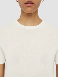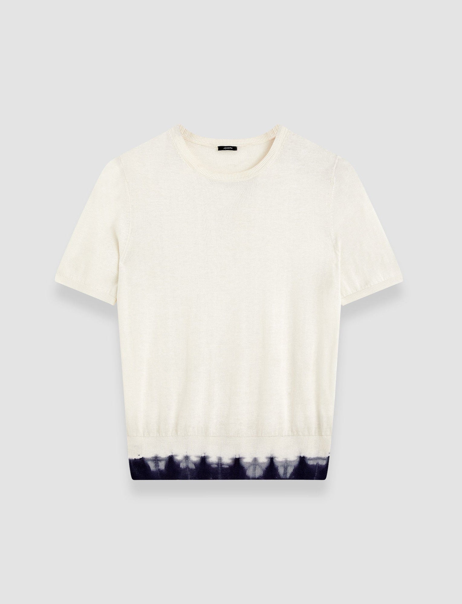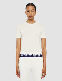 The Silk & Cotton Knit Top is a short sleeve knitted top, crafted from a blend of silk and cotton. This piece is luxuriously smooth and lightweight, and features a tie-dye hemline. - Designed for a regular fit - Tie-dye hemline - Lightweight - Product code: jf0090530198 - Ivory/Navy SIZE ADVICE - Model wears size S CARE & MATERIALS Discover the Care Guide, a guide to help you to care for your garments. - 57% Silk 43% Cotton - Do not wash - Do not bleach - Do not tumble dry - Iron low temperature setting - Dry clean