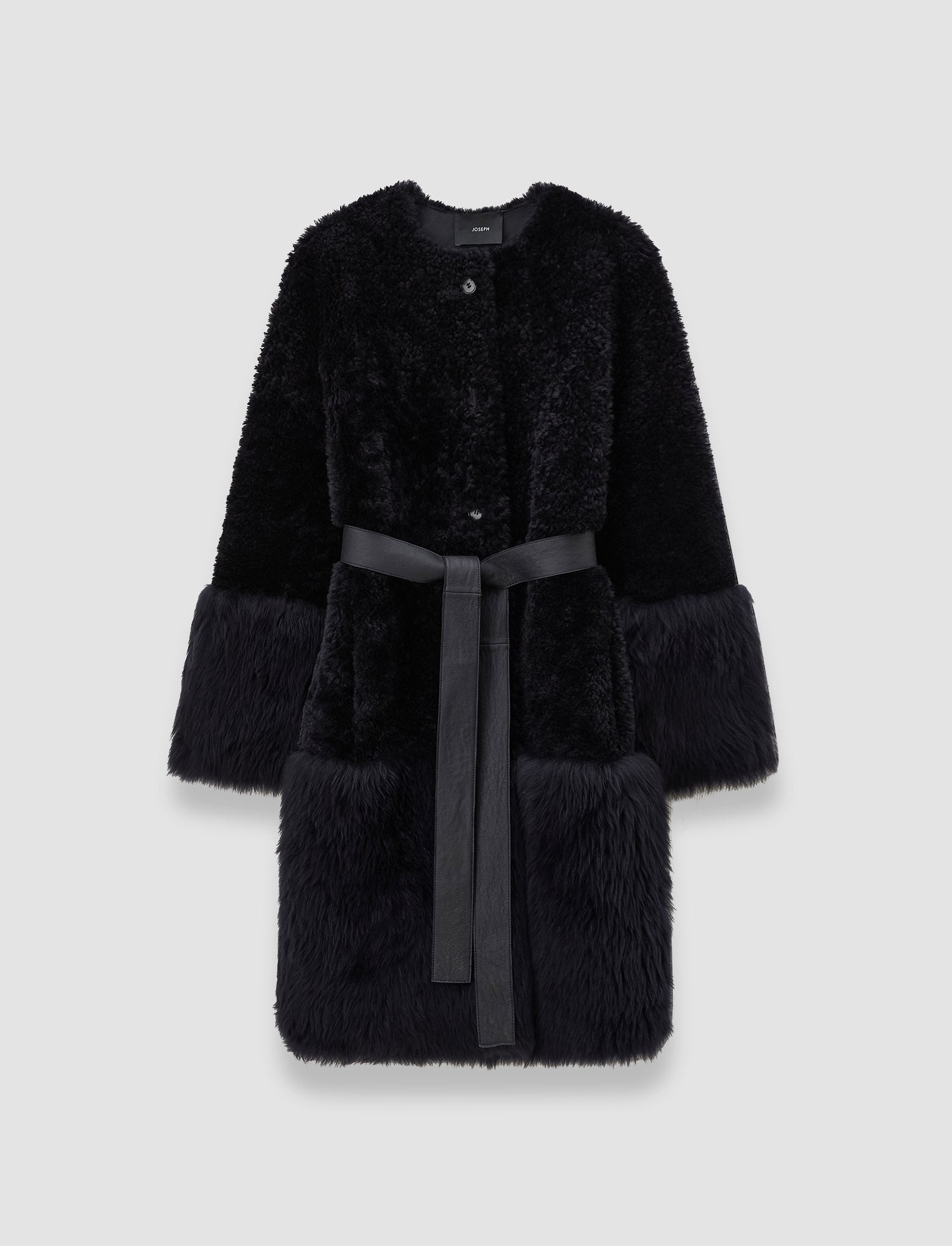 The Tina Shearling Coat is a regular fit coat, crafted from 100% shearling. Offering a luxurious, tactile experience, this coats expertly blends two shearling textures: short-curly and a long fur variety. It's classic cut and collarless design ensures comfort and room for layering over your favourite knitwear. Model wears size FR 38/UK 10/EU 36/US 6/DE 36/IT 42/JP 9 Details - Designed for a regular fit - Button fasten - Mid-length - Collarless - Leather inside - Statement long fur cuffs and hem - Side pockets - Removable belt - Product code: jf0094690261 Care & Materials - 100% Sheepskin - Do not wash - Do not bleach - Do not iron - Do not tumble dry - Do not dry clean - Cleaning by a leather specialist only