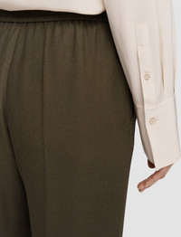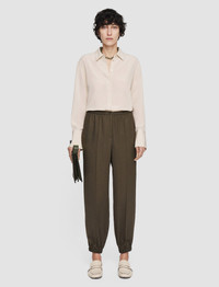 The Viscose Twill Taio Trousers are a relaxed fit, mid-rise trouser, crafted from a lustrous viscose. These trousers have a smooth hand feel and a subtle woven texture. They feature an elasticated waistband with a zip and button fasten, and elasticated cuffs. An elevated take on the jogger silhouette, offering a clean, off-duty look. - Designed for a relaxed fit - Mid-rise - Subtle volume - Side pockets - Elasticated waistband and cuffs - Delicate fabric, handle with care - Product code: jp0016481203 SIZE ADVICE - Model wears French size 36 Discover the Trouser Guide and find your perfect fit CARE & MATERIALS - 100% Viscose - Do not wash - Do not bleach - Do not tumble dry - Iron low temperature setting - Dry clean very light with restriction