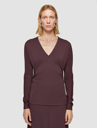 The Wool Jersey V Neck Top is a slim fit style, crafted from a wool blend. This top has a soft hand feel and features ruched sides for an elegant look. Model wears size S Details - Designed for a slim fit - Ruched sides and cuffs - Product code: jf0093391602 Care & Materials - 80% Polyester 20% Wool - Delicate machine wash at 30 degrees - Wash inside out - Do not bleach - Do not tumble dry - Iron low temperature setting - Do not dry clean - Wash with similar colours