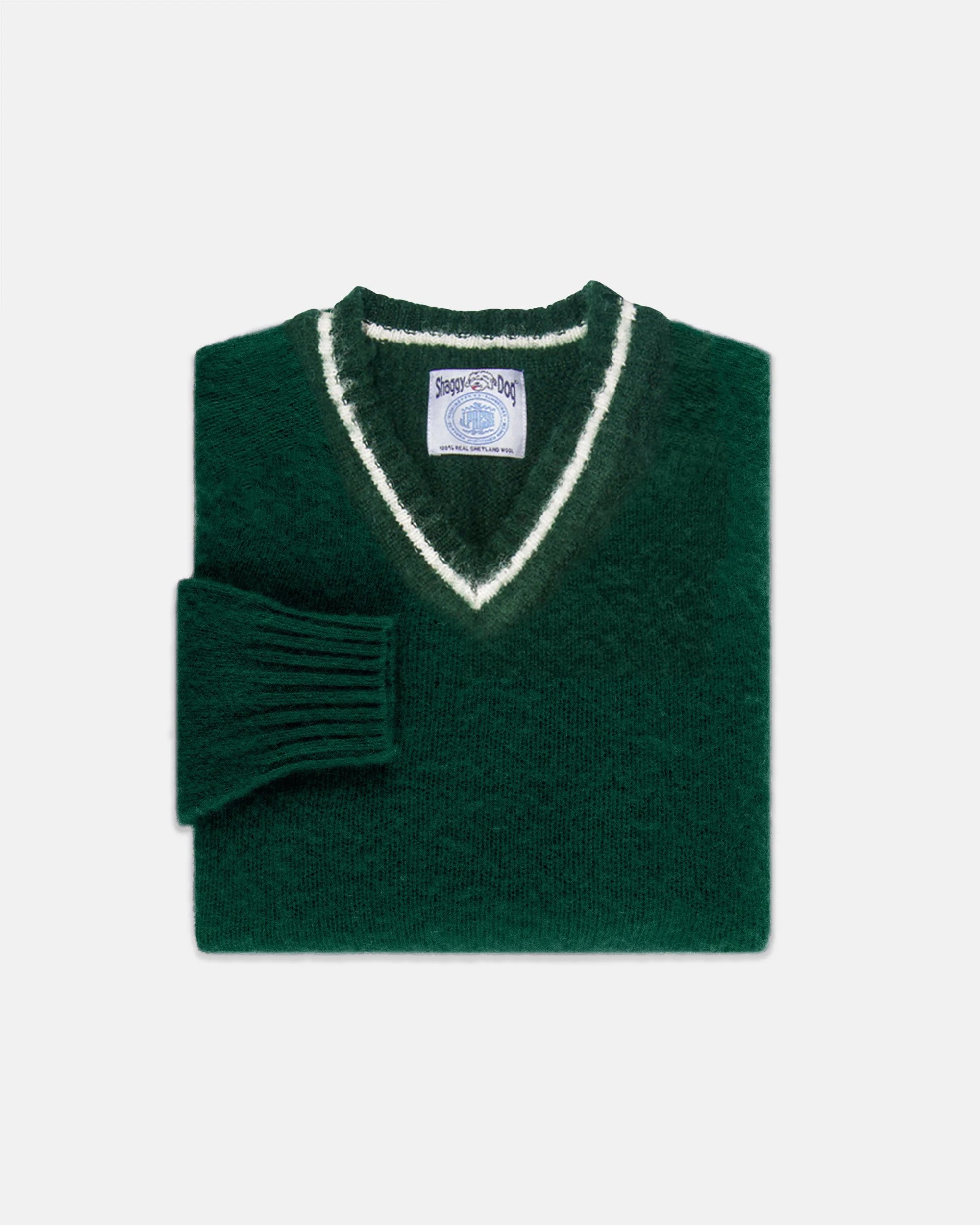 - Trim Fit - 100% Hand Brushed Shetland Wool - V-Neck - Saddle Shoulder - Contrast Color at Neck and Waistlines - Dry Clean Only - Made in Scotland The J. Press Icon For nearly 80 years our Shaggy Dog sweater has been considered the gold standard of Shetland sweaters. Still made in Scotland from pure Shetland wool and hand brushed to perfection, it is celebrated for its rich color, thick construction, and incredibly soft-to-the-touch feel.