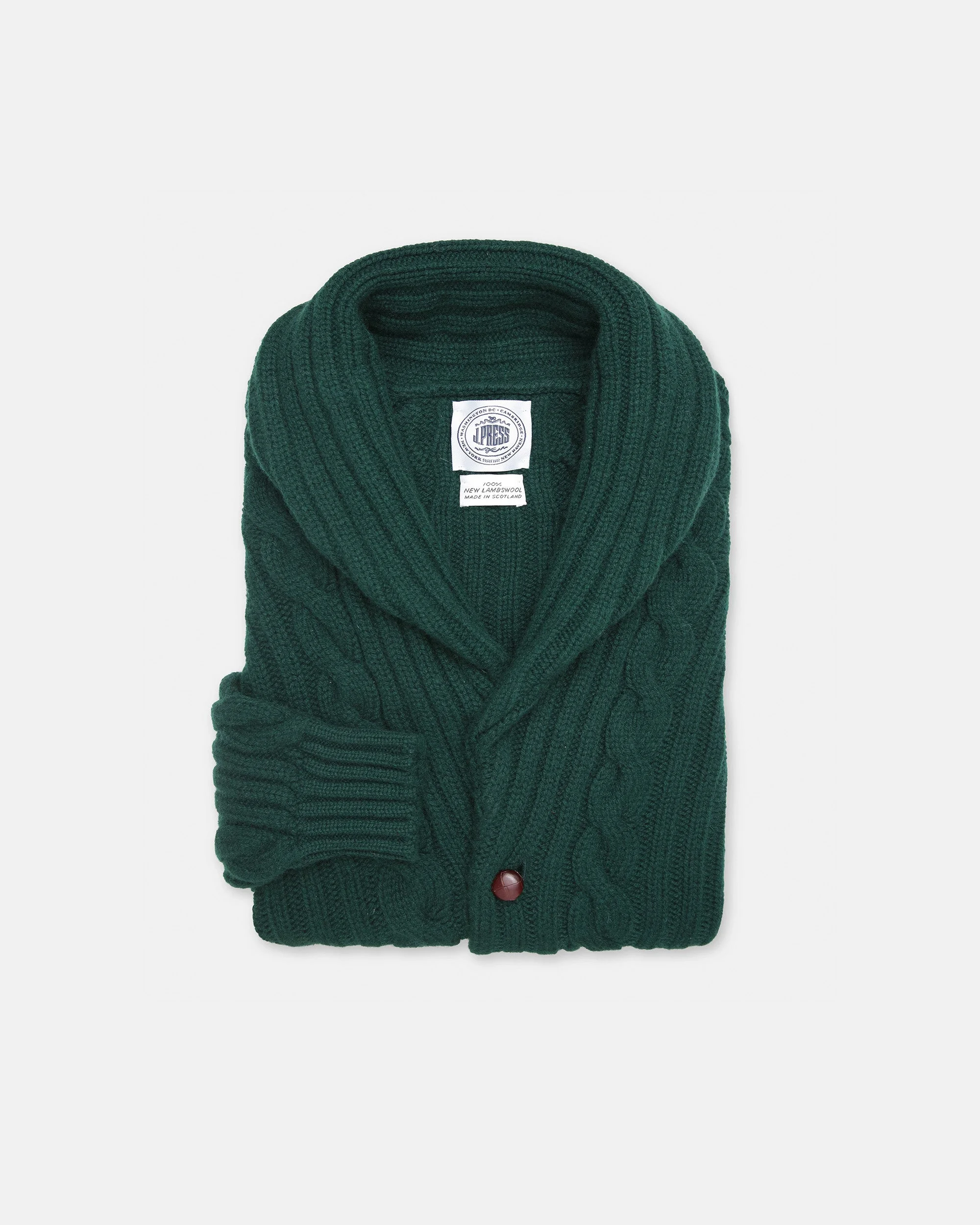 MADE-IN-SCOTLAND GREEN SHAWL COLLAR CABLEKNIT CARDIGAN