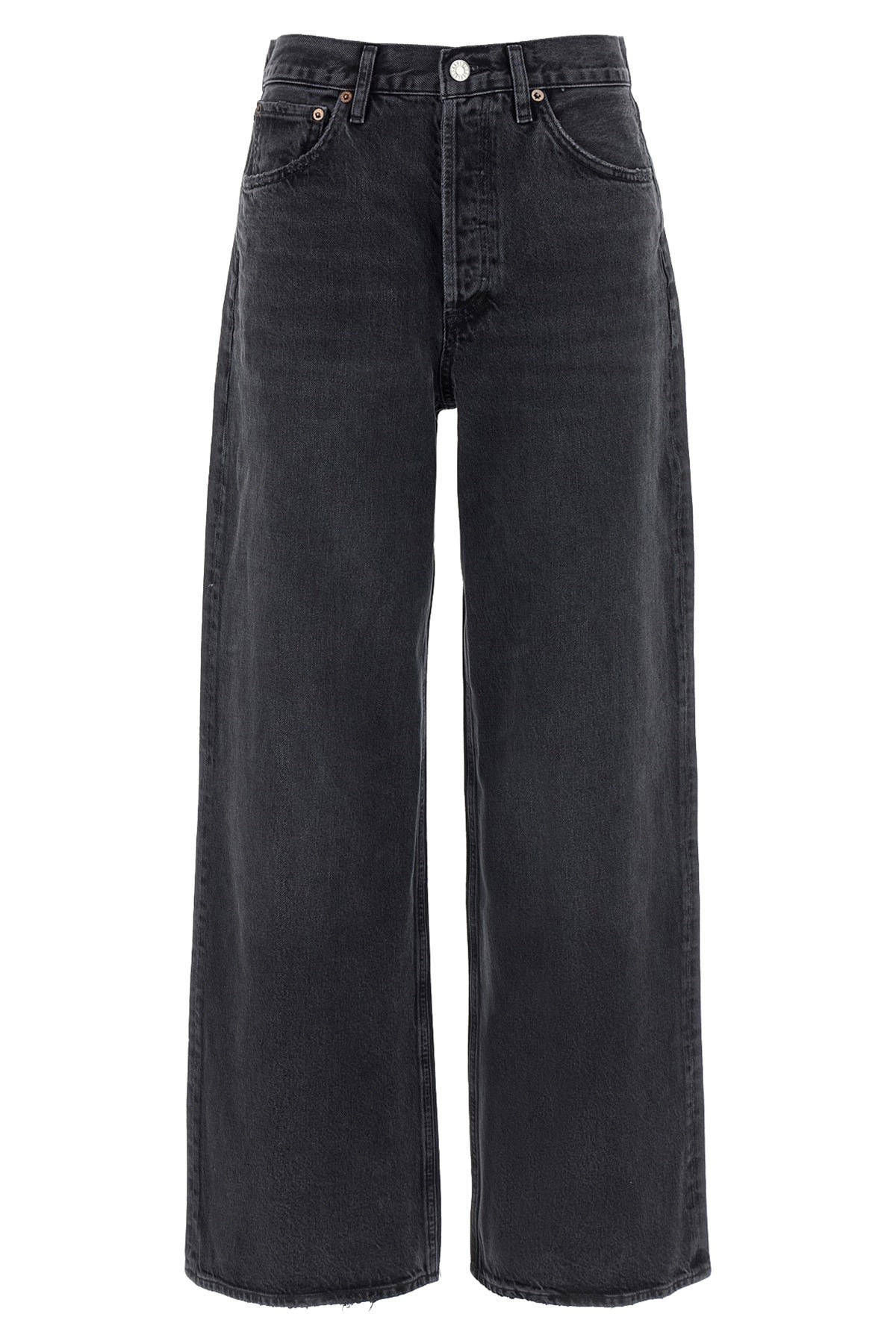 cod. A1981157HICH 'Dame' jeans in used-effect delave cotton denim with high waist and wide leg, front button closure, five pockets. SUSTAINABLE: This product is made of regenerated cotton. Color: Black Size & Fit: true to size fit Composition: 100% regenerative cotton Made in: Turkey
