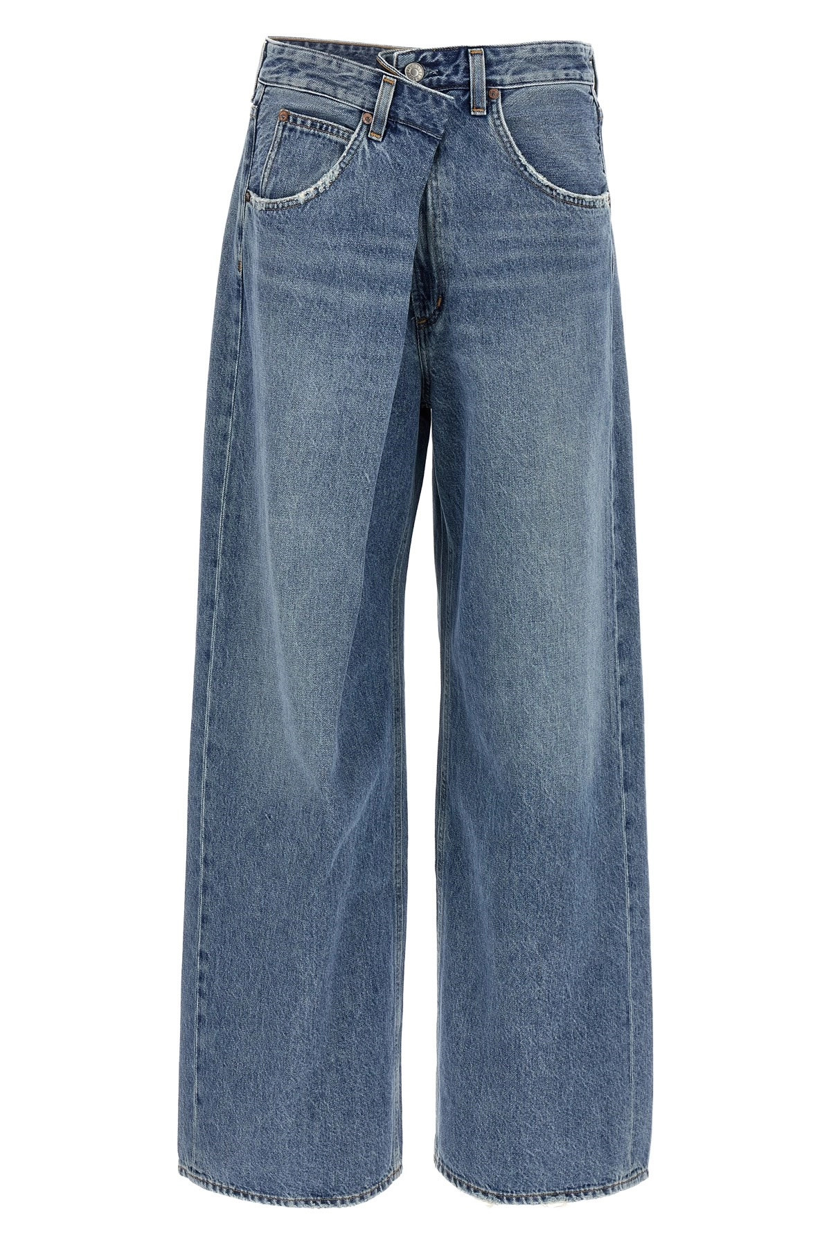 cod. A2411765MANT 'Vana' stonewashed cotton denim jeans with low crotch and wide leg, book closure with zip, hook and front button, five pockets. SUSTAINABLE: This product is made of regenerated cotton. Color: Light Blue Size & Fit: true to size fit Composition: 100% regenerative cotton Made in: United States