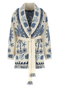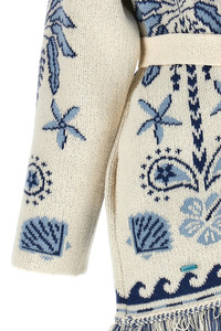 cod. LWHB064R26KNI003OF45OF45 Double 'Echoes Of The Island' cotton and wool blend knit cardigan with textured scarf, 'Icon' fit, dressing gown style with shawl neckline and frayed edges, long sleeves, pockets, removable belt. Color: Multicolor Size & Fit: true to size fit Composition: 60% wool, 40% cotton Made in: Italy
