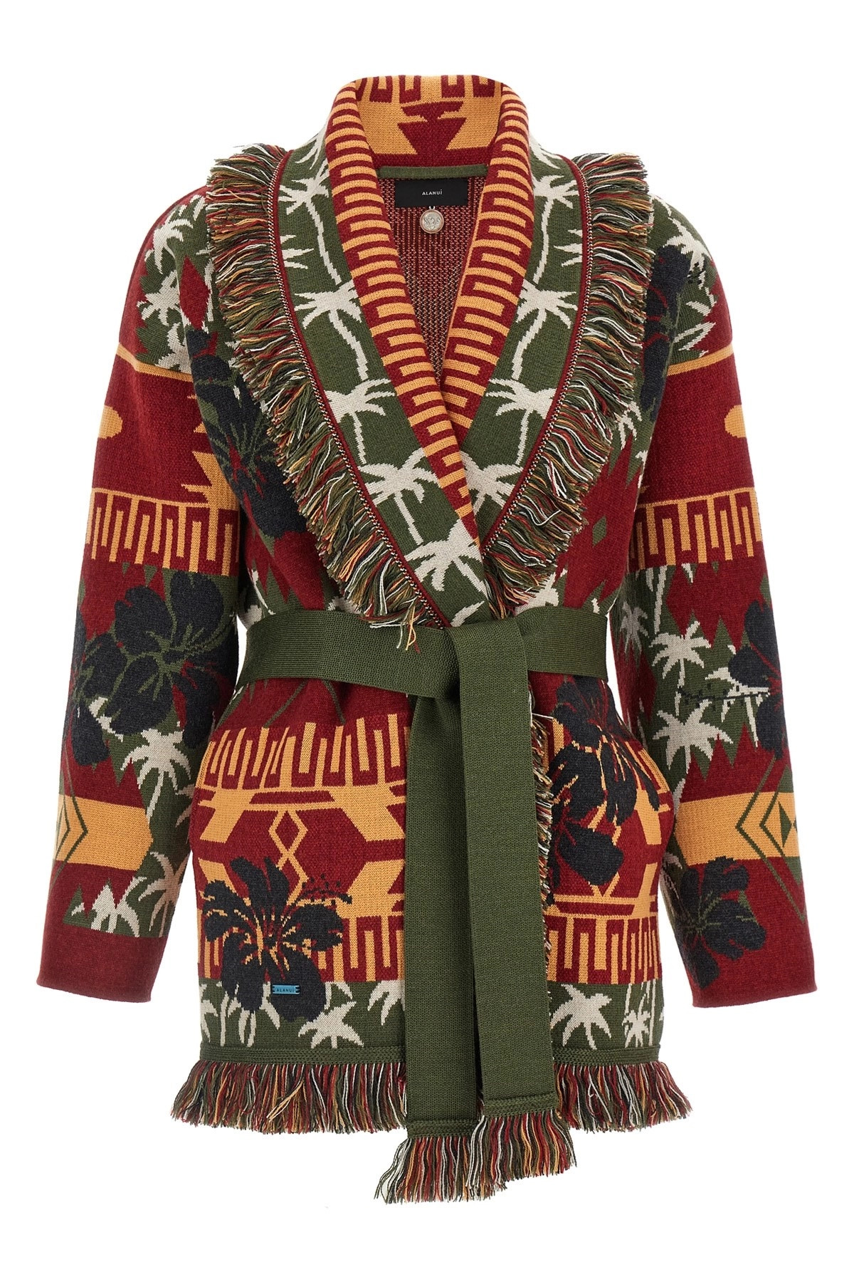 cod. LWHB064E25KNI00956255625 Hibiscus Bloom' virgin wool cardigan with all-over jacquard pattern, fringed detail at the edges and back, belt at the waist, pockets, long sleeves. Color: Multicolor Size & Fit: true to size fit Composition: 100% virgin wool Made in: Italy