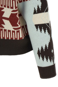 cod. LWHB026R26KNI001416E416E Cashmere and virgin wool cardi-bomber jacket with double jacquard 'Alanui' pattern, bomber cardigan, shawl collar with fringes, front button closure, long sleeves with cuffs and dropped shoulder. Color: Multicolor Size & Fit: true to size fit Composition: 70% wool 30% cachemire Made in: Italy