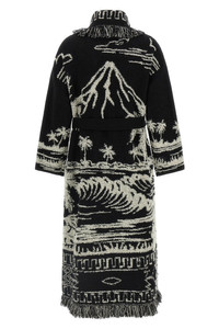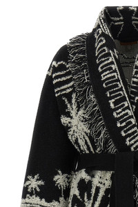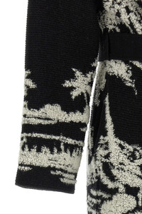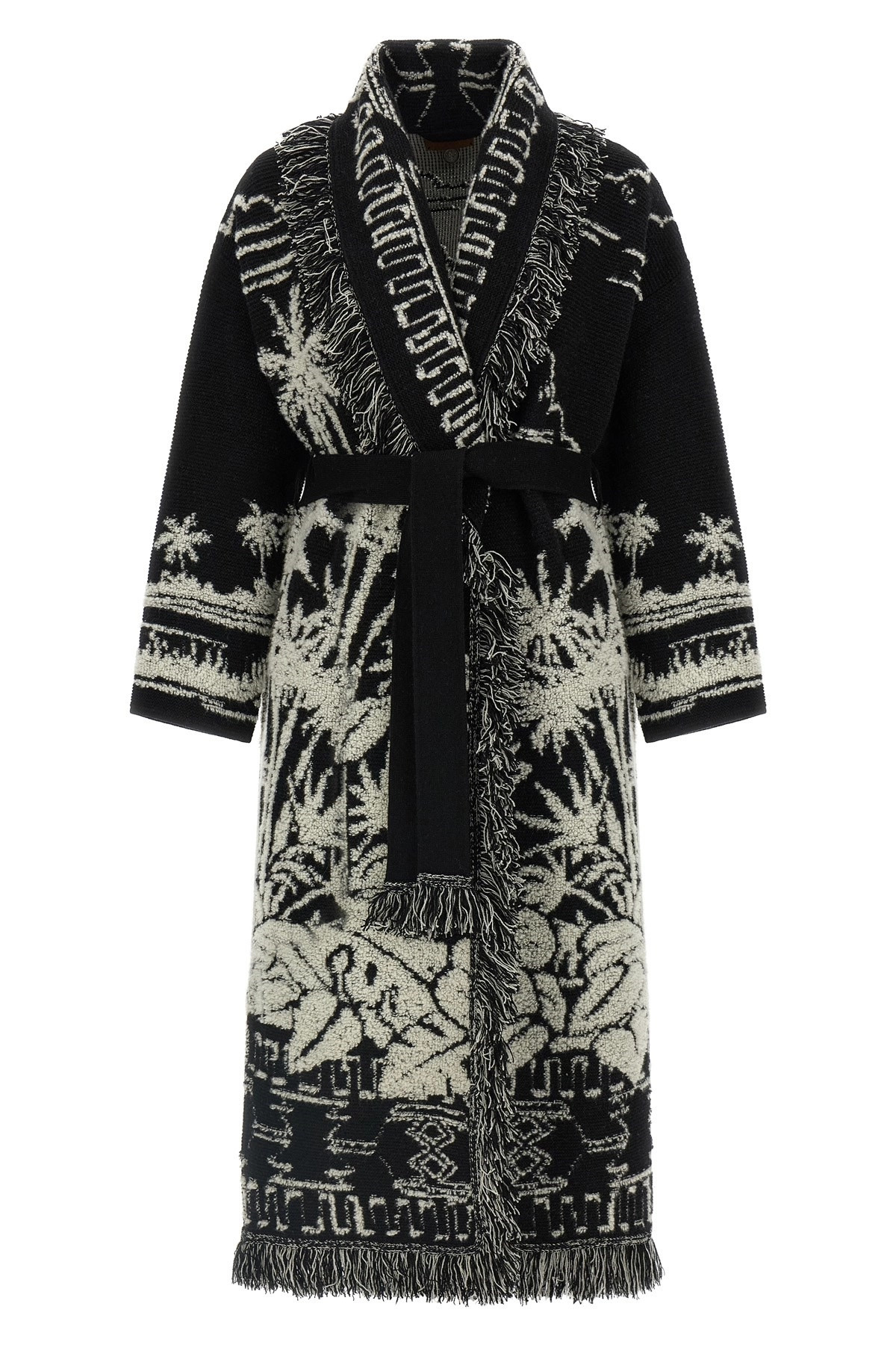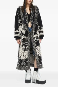 cod. LWHQ003E25KNI003100F100F 'Palm Grove Tales' cashmere and wool blend long coat with a 3D double jacquard sweater, 'Icon Coat' fit, dressing gown with shawl neckline and frayed edges, long sleeves, pockets, removable belt. Color: White/Black Size & Fit: true to size fit Composition: 91% ws 5% wo, 4% pa Made in: Italy