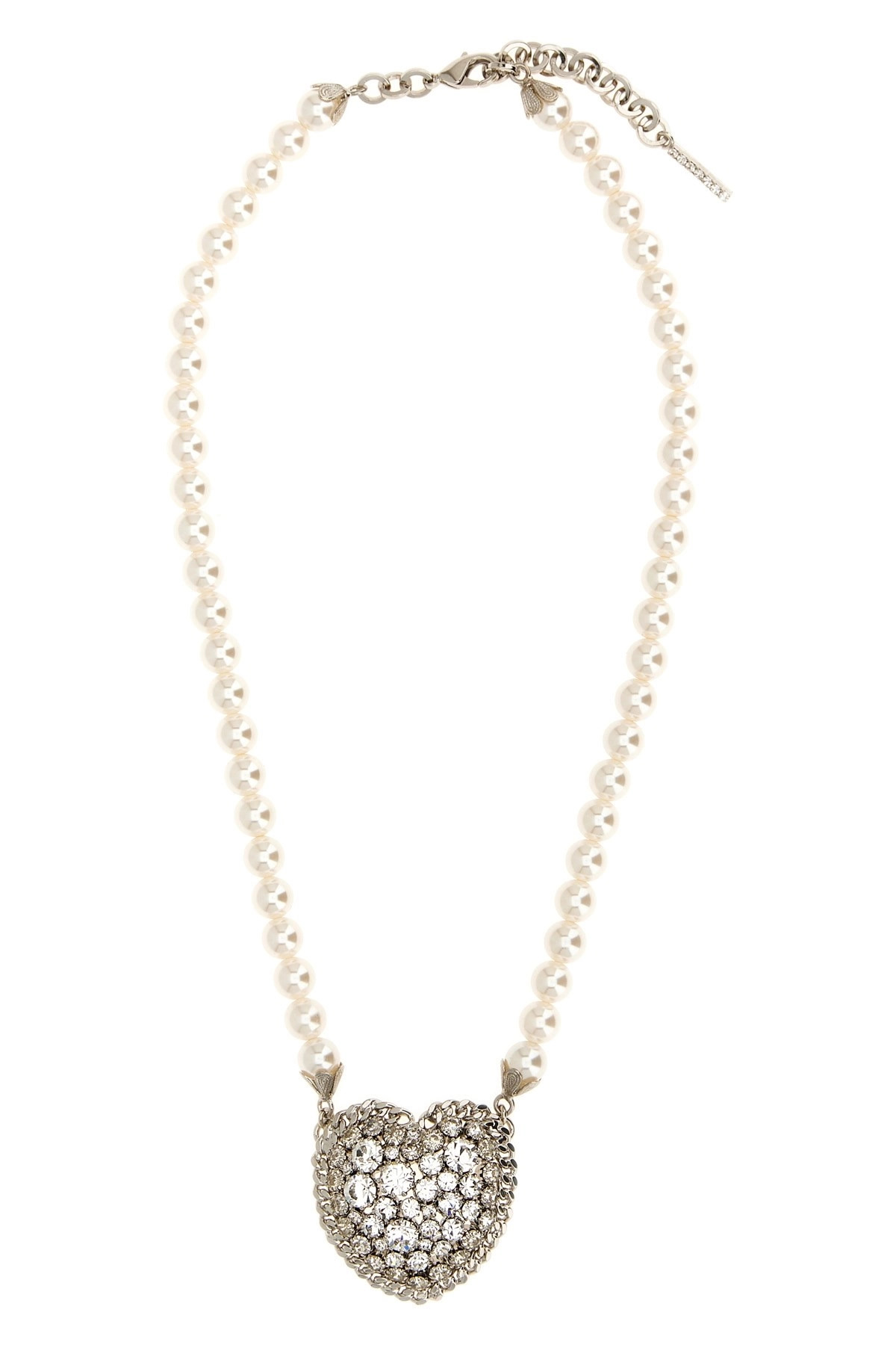 cod. FABA3286J00340001 Pearl necklace with metal heart and rhinestones, snap hook closure, adjustable. Color: White Size & Fit: One size Composition: 100% glass Made in: Italy