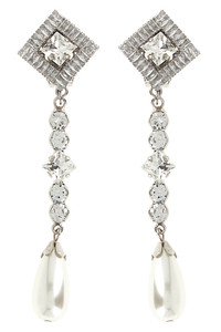 cod. FABA3328J00340001 Metal earrings with crystals, pearls and baguette crystals, pendant model, clip closure. ITEM CANNOT BE RETURNED Color: Silver Composition: 100% plastic Made in: Italy