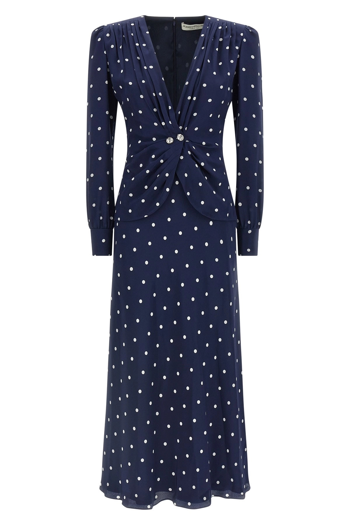 cod. FABX4108F46551643 All-over polka dot silk twill midi dress consisting of blazer top with pin tucks, ruffles, V-neck, front jewel button detail, long sleeves with crinkled shoulder strap and cuff, A-line silhouette skirt, petticoat, and back zip closure. Color: Blue Size & Fit: true to size fit Composition: 100% silk Made in: Italy