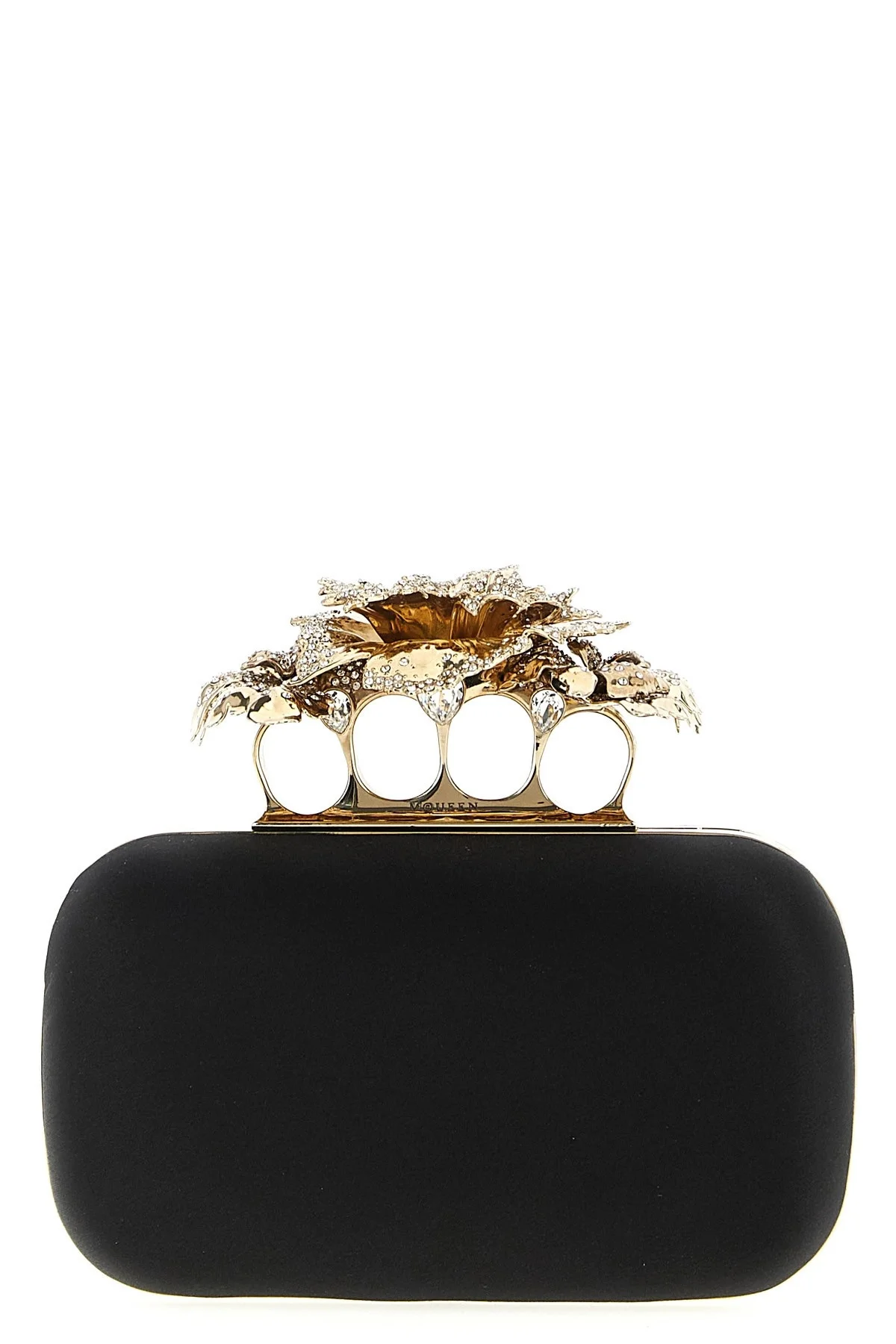 cod. 8456481HBC31000 'Carnation' satin clutch, handle with four rings antiqued gold finish with Swarovski crystals, interlocking closure, removable chain shoulder strap. Color: Black Size & Fit: W 18 x H 10 x D 5 cm Composition: 100% silk Made in: Italy