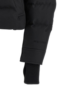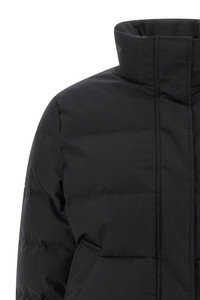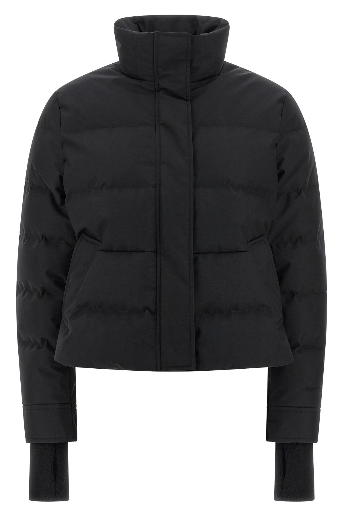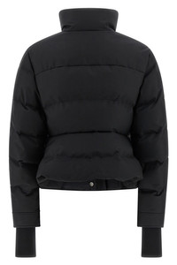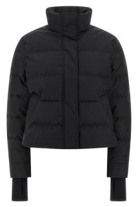 cod. 842818QEAG11000 Quilted and goose feather padded technical fabric down jacket, crop style with hourglass silhouette, standing collar, zip and snap button closure on the front, pockets, long sleeves with knitted cuffs and tone-on-tone embroidered logo, slightly ruffled hem. Color: Black Size & Fit: true to size fit Composition: 100% polyamide Made in: Italy
