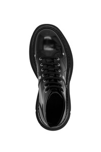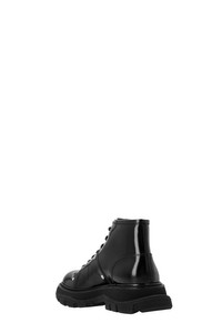 cod. 595469WHZ811081 Alexander McQueen leather ankle boots featuring contrasting stitching and an oversize rubber sole, and laces. Color: Black Size & Fit: EU WOMAN Composition: 100% leather Made in: Italy