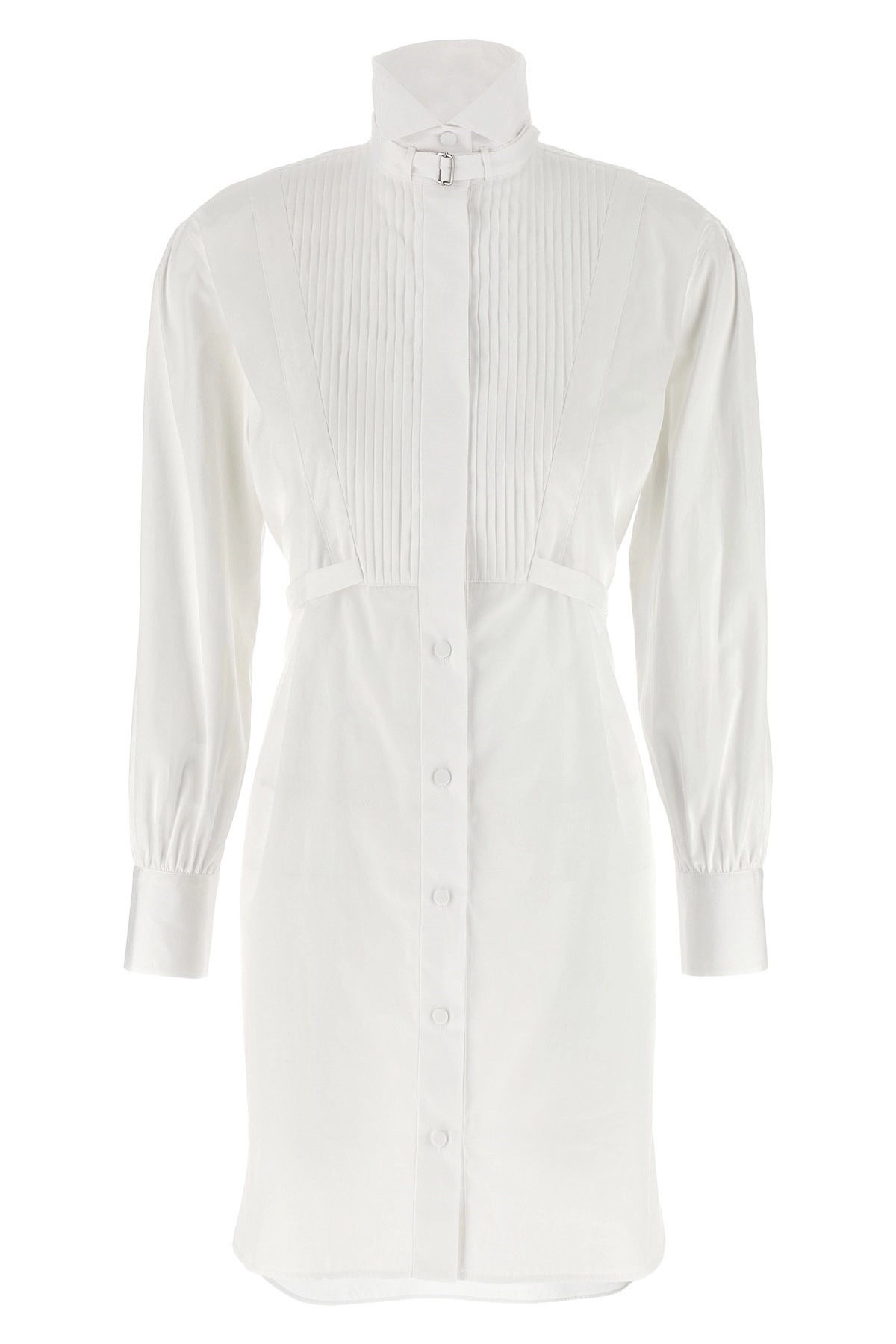 cod. 834043QAABS9000 Chemisier dress in cotton poplin with pleated plastron, raised collar with adjustable strap, front button closure, side slits, long sleeves with cuffs and dropped shoulder, belt. SUSTAINABLE: This product is made of organic cotton. Color: White Size & Fit: oversized fit Composition: 100% cotton Made in: Italy
