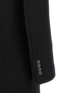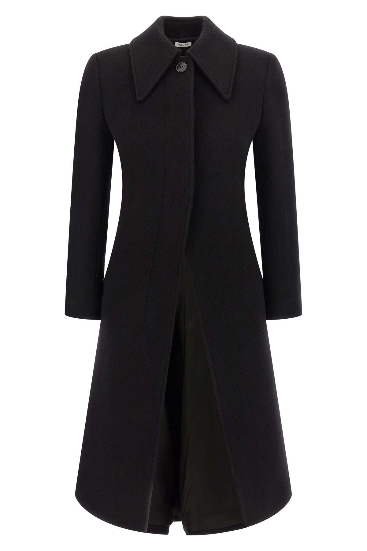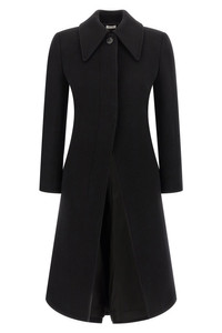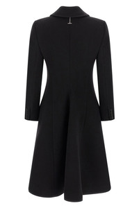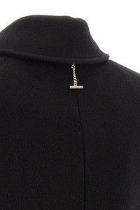 cod. 842822QKABR1000 Single-breasted wool and cashmere blend coat with front button closure, hourglass silhouette, back metal detail, shirt collar, welt pockets, structured shoulder strap, long sleeves, wheel hem, lining. Color: Black Size & Fit: true to size fit Composition: 50% cachemire 50% wool Made in: Italy