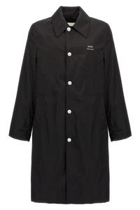 cod. UJK542PA0007001 Water-repellent trench coat in technical twill blend nylon and cotton, metal logo applique on the front, snap button closure, long sleeves, pockets, back split. Color: Black Size & Fit: true to size fit Composition: 70% polyamide 30% cotton Made in: Romania