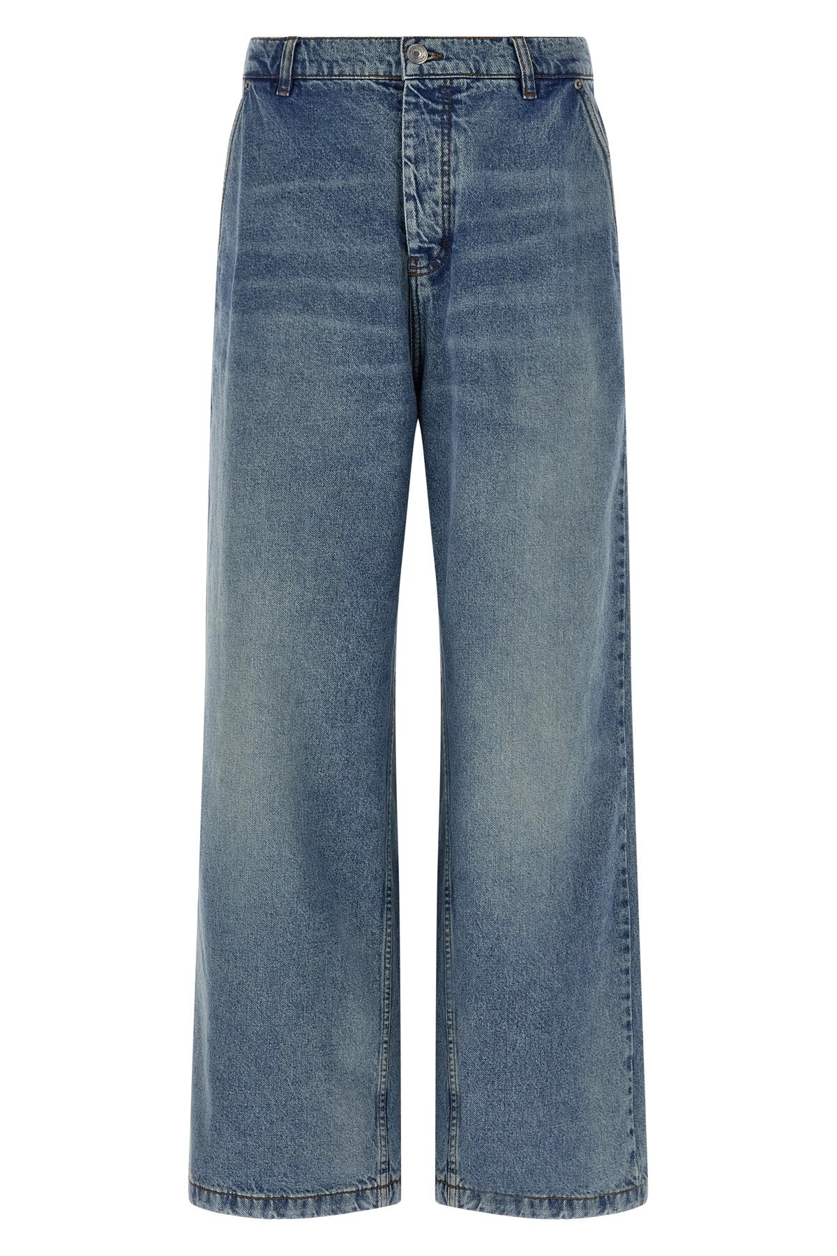 cod. HTR821DE0046480 Stonewashed cotton denim jeans with contrast stitching, and straight, wide leg. Front button closure, five pockets, adjustable strap at the back. Color: Light Blue Size & Fit: true to size fit Composition: 100% cotton Made in: Portugal