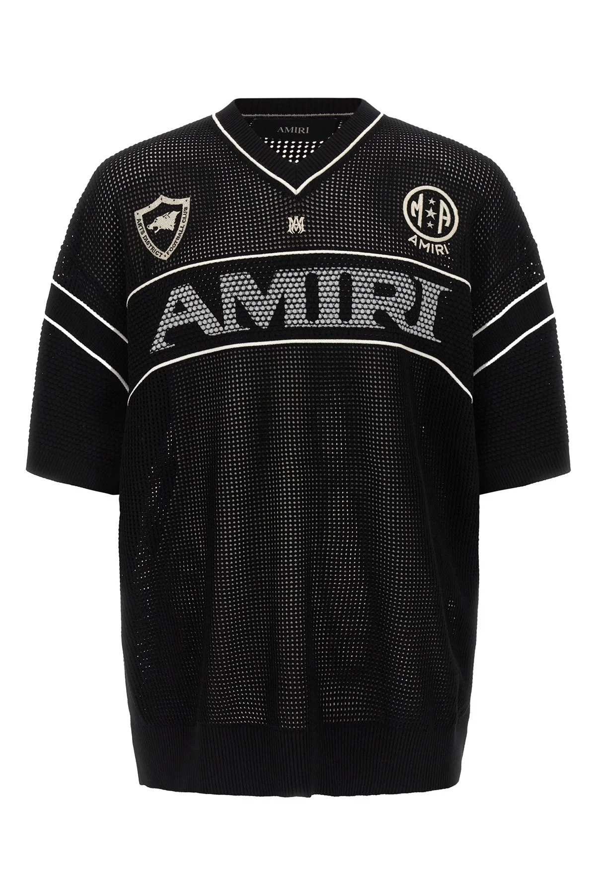 cod. AWTOKN1046001 'Amiri Sport' viscose mesh knit T-shirt with contrast embroidery on the front and back, V-neck, short sleeves with dropped shoulders. This garment has undergone a special process that has resulted in intentional variations in shades and colors and adds unique characteristics to the garment. Color: Black Size & Fit: oversized fit Composition: 70% viscose, 30% polyester Made in: Italy